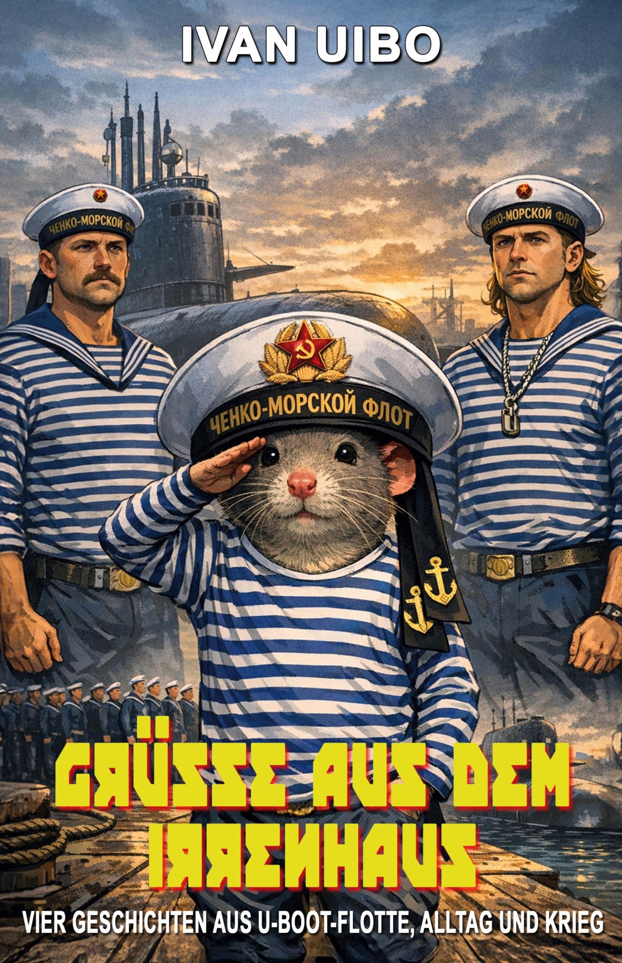 "GRÜSSE AUS DEM IRRENHAUS", darunter ein Untertitel über Geschichten. Illustration: Eine Ratte salutiert zwischen Matrosen., Buch
