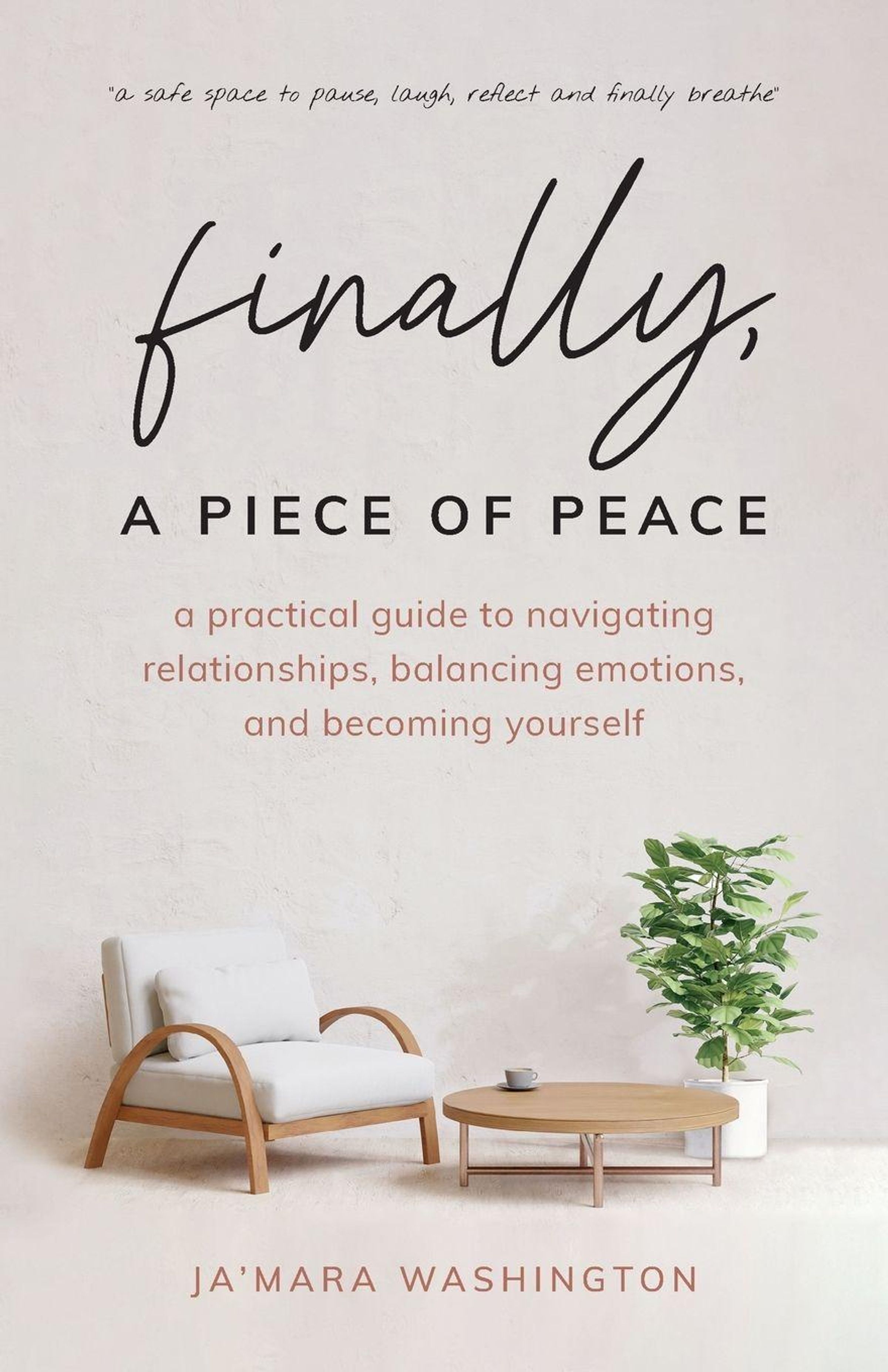 "Finally, A Piece of Peace." Gemütliche Szene: Ein Sessel, Tisch mit Tasse, Pflanze. Autorenname: Ja'Mara Washington., Buch