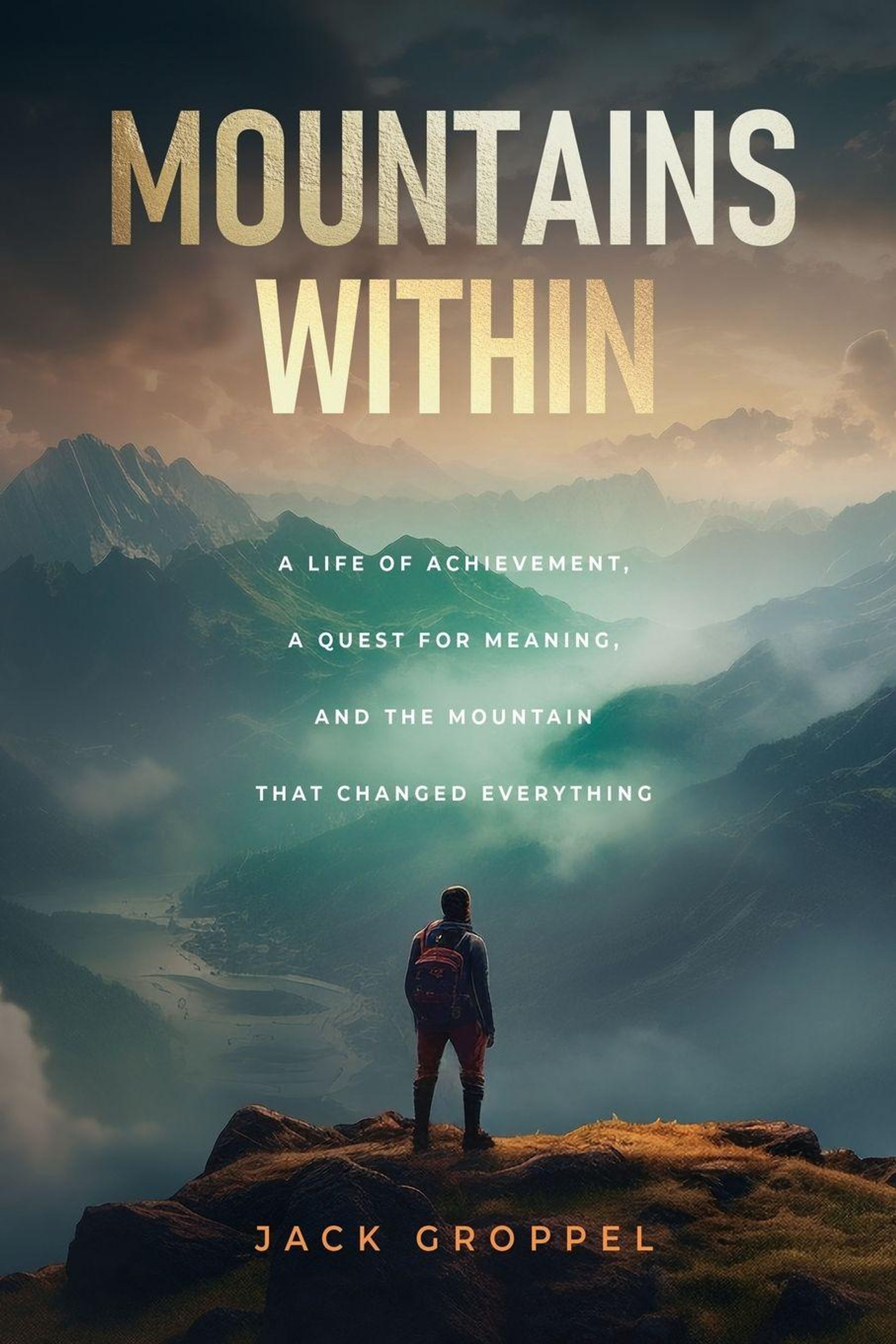 "MOUNTAINS WITHIN: A Life of Achievement, A Quest for Meaning, and the Mountain that Changed Everything" von Jack Groppel. Eine Person steht auf einem Felsen und blickt auf ein Gebirgspanorama., Buch