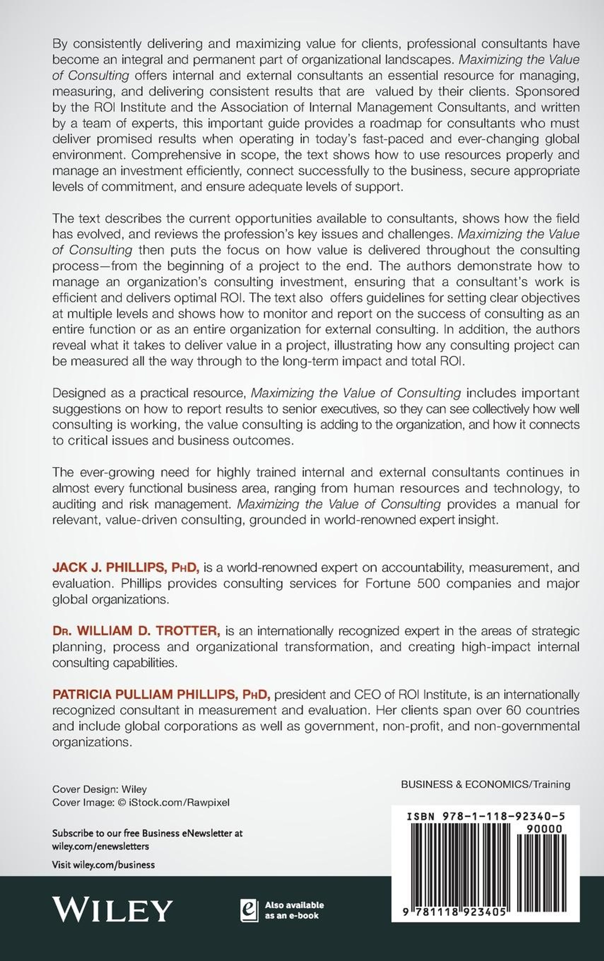 By consistently delivering and maximizing value for clients, professional consultants have become an integral and permanent part of organizational landscapes. Maximizing the Value of Consulting offers internal and external consultants an essential resource for managing, measuring, and delivering consistent results that are valued by their clients. Sponsored by the ROI Institute and the Association of Internal Management Consultants, and written by a team of experts, this important guide provides a roadmap for consultants who must deliver promised results when operating in today's fast-paced and ever-changing global environment. Comprehensive in scope, the text shows how to use resources properly and manage an investment efficiently, connect successfully to the business, secure appropriate levels of commitment, and ensure adequate levels of support.