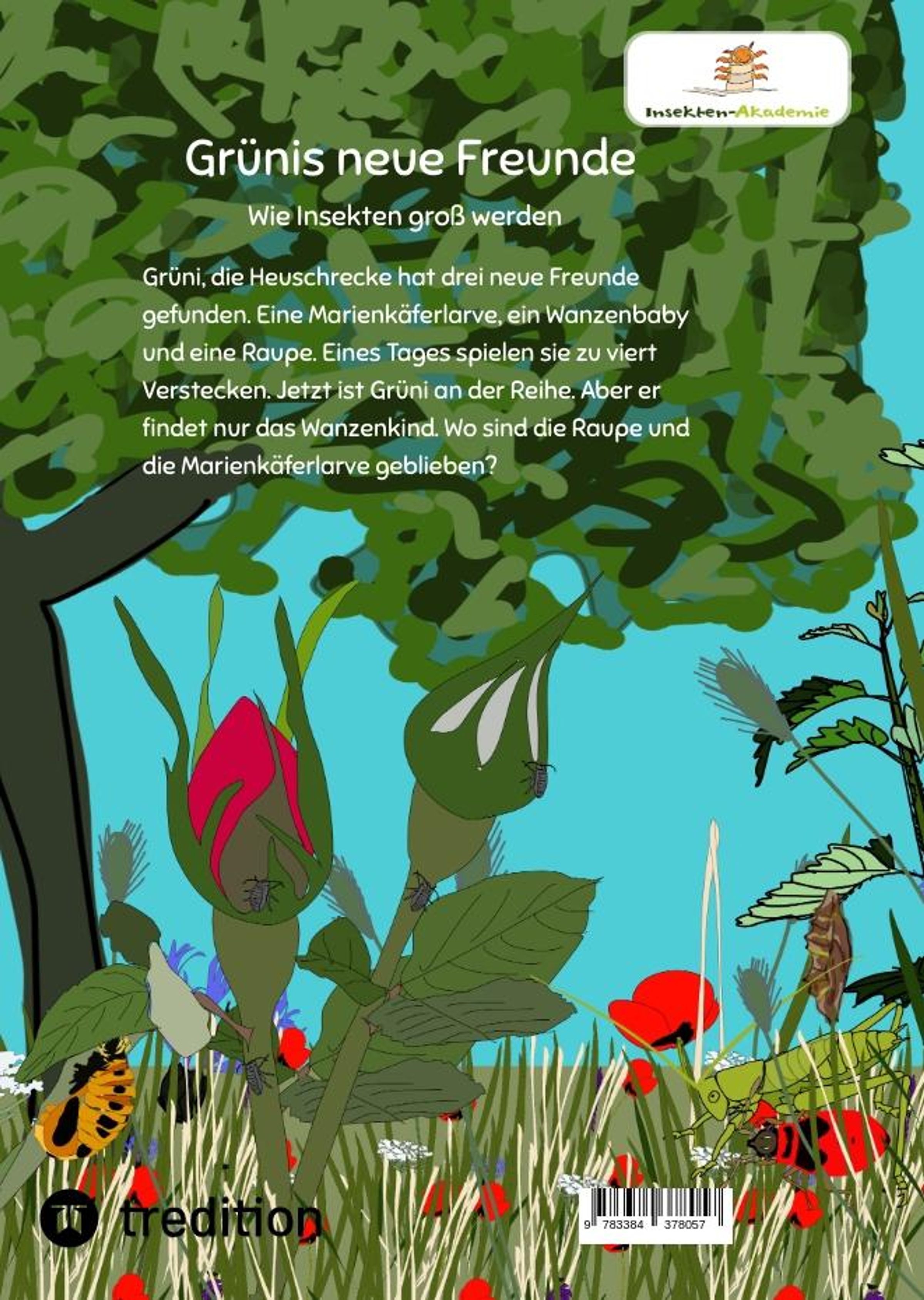 Im Buch "Grünis neue Freunde" lernen Kinder mit der Hilfe von Grüni, der Heuschrecke, Roti, der Feuerwanze, Marie, dem Marienkäfer und Lara, dem Schmetterling, wie die vollständige und die unvollständige Metamorphose funktionieren: