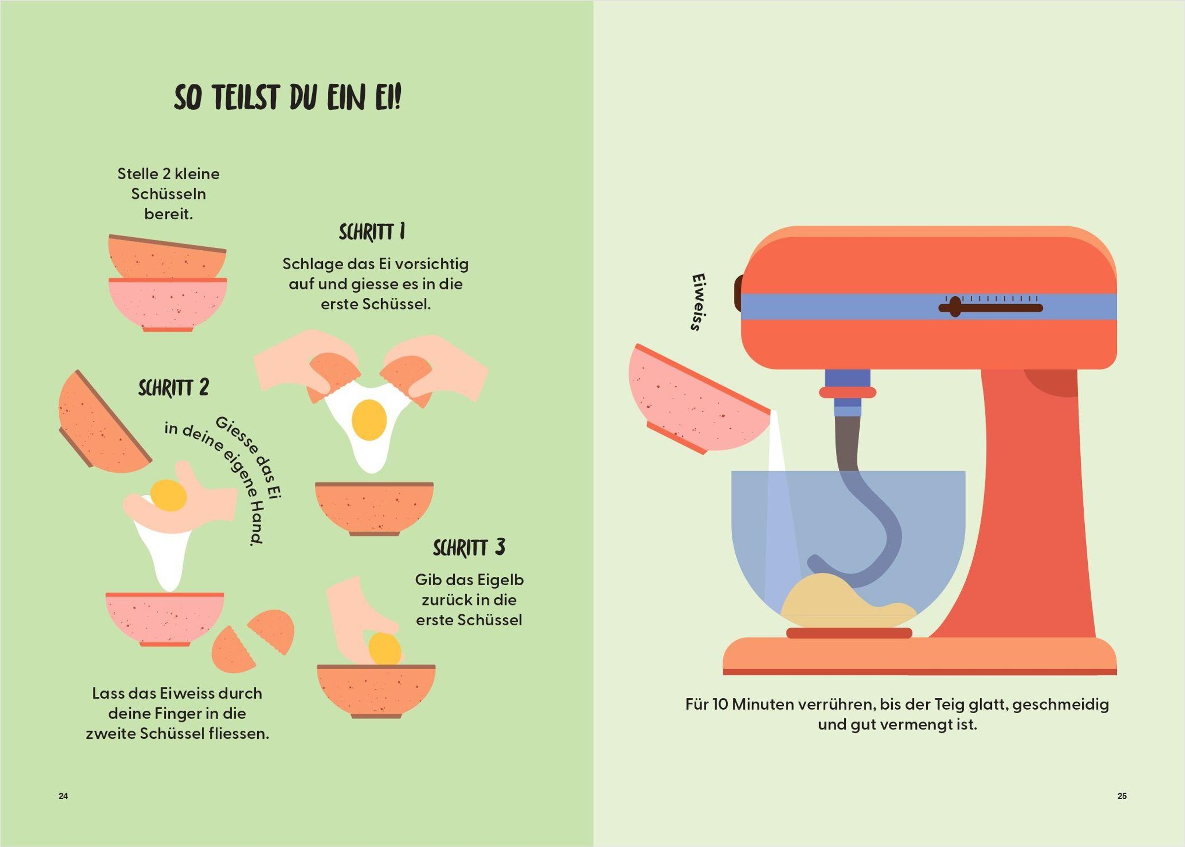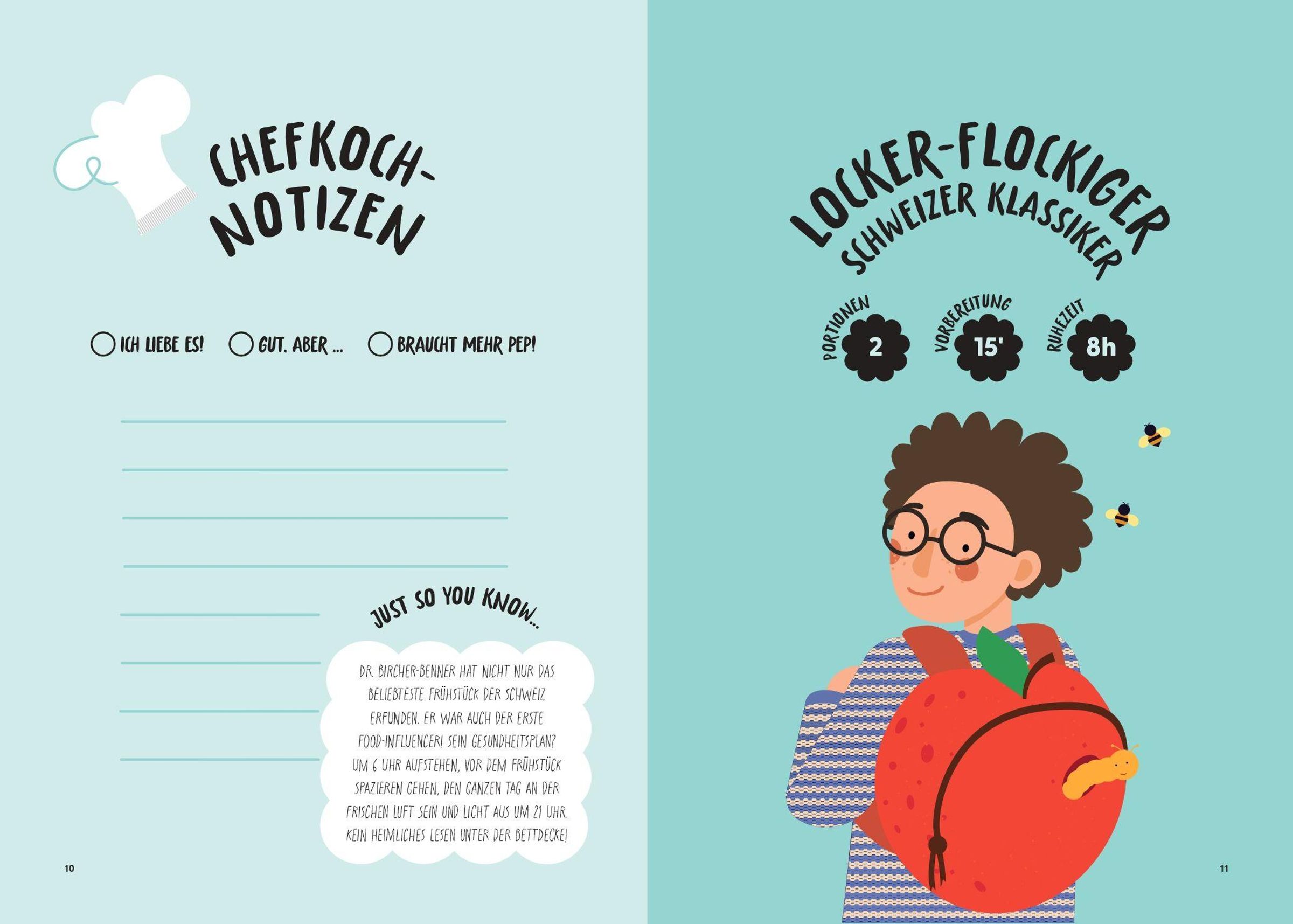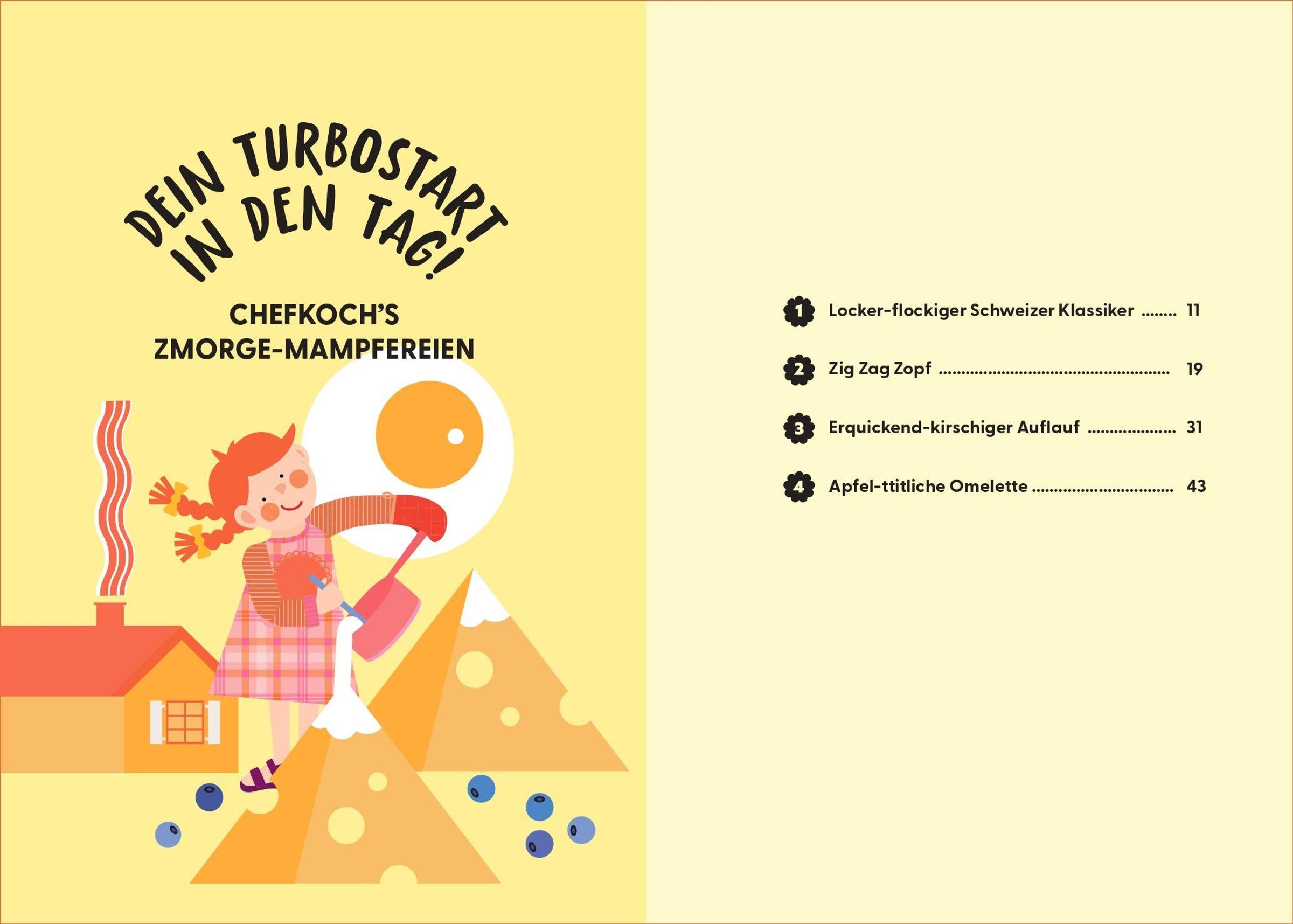 "ZIG ZAG ZOPF" und "SCHWEIZER KÜCHE FÜR KINDER" auf gelbem Hintergrund. Zwei fröhliche Kinder, eines mit Schüssel., Buch