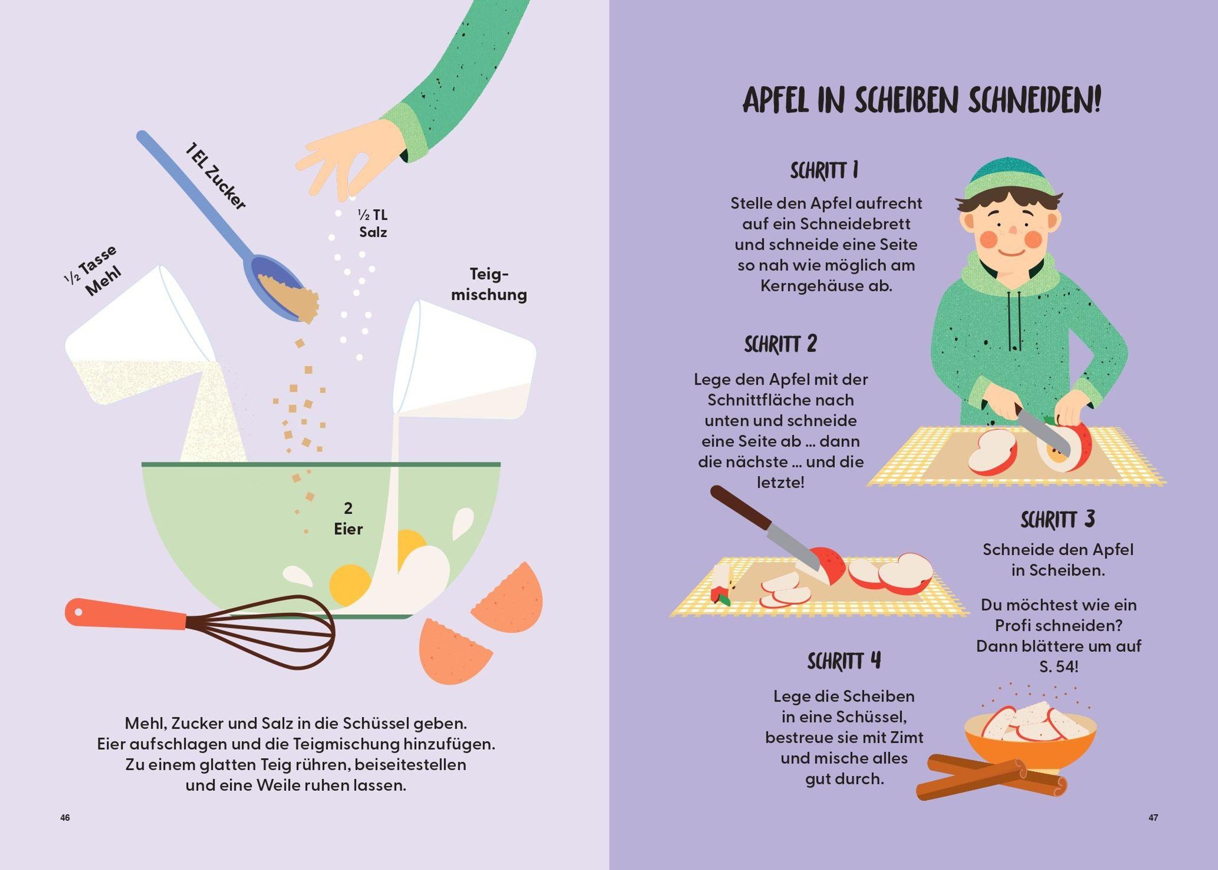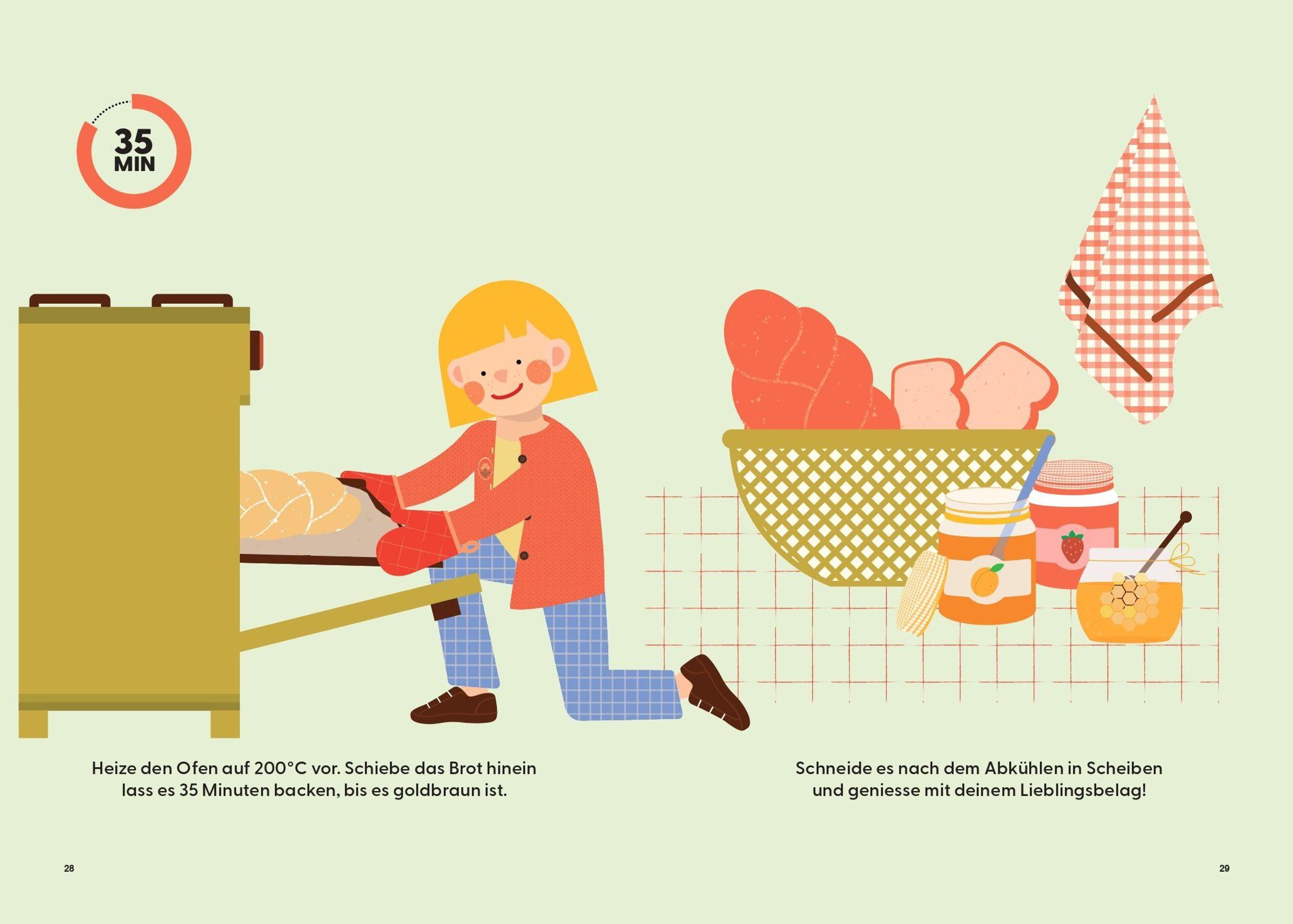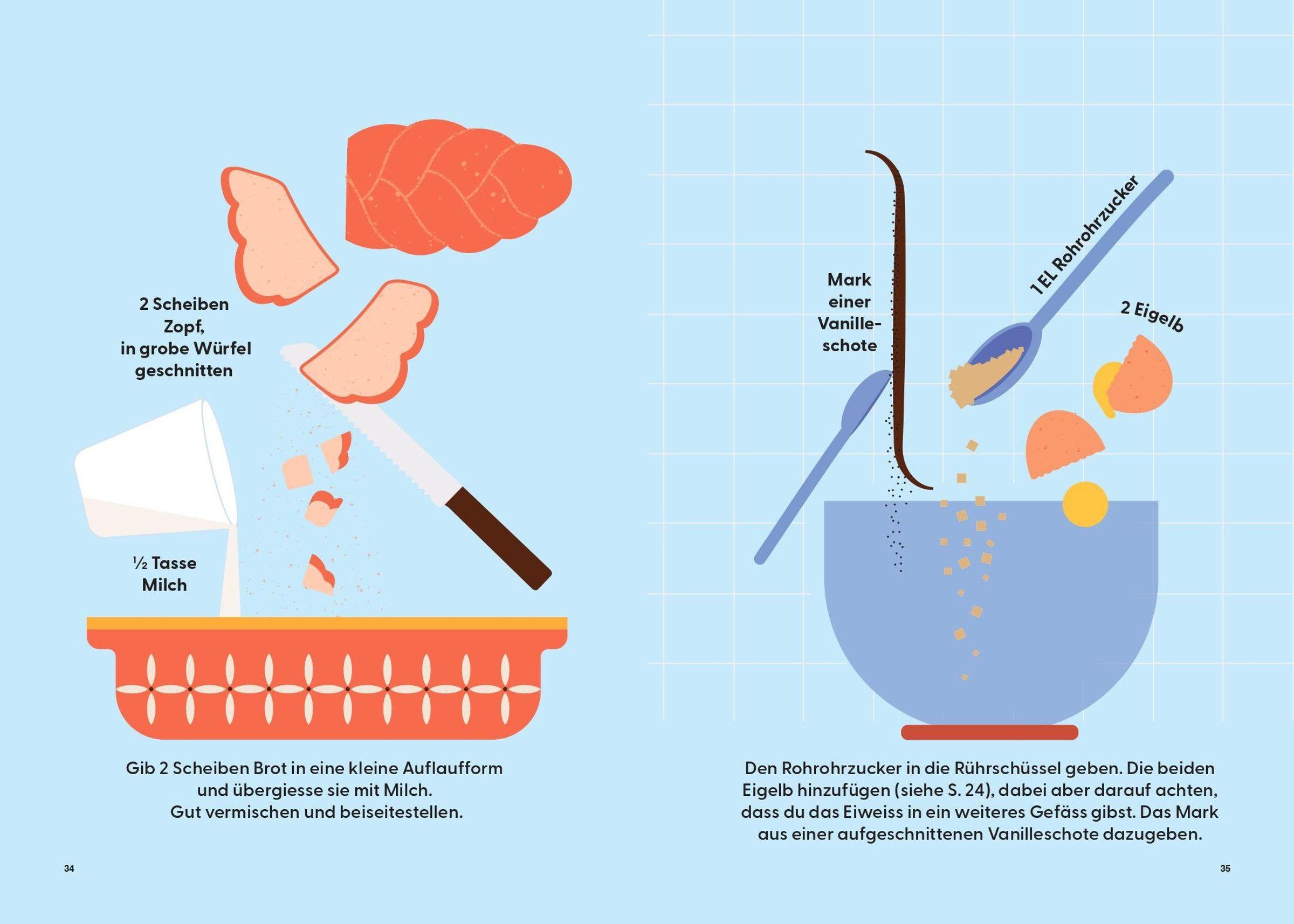 "ZIG ZAG ZOPF" und "SCHWEIZER KÜCHE FÜR KINDER" auf gelbem Hintergrund. Zwei fröhliche Kinder, eines mit Schüssel., Buch