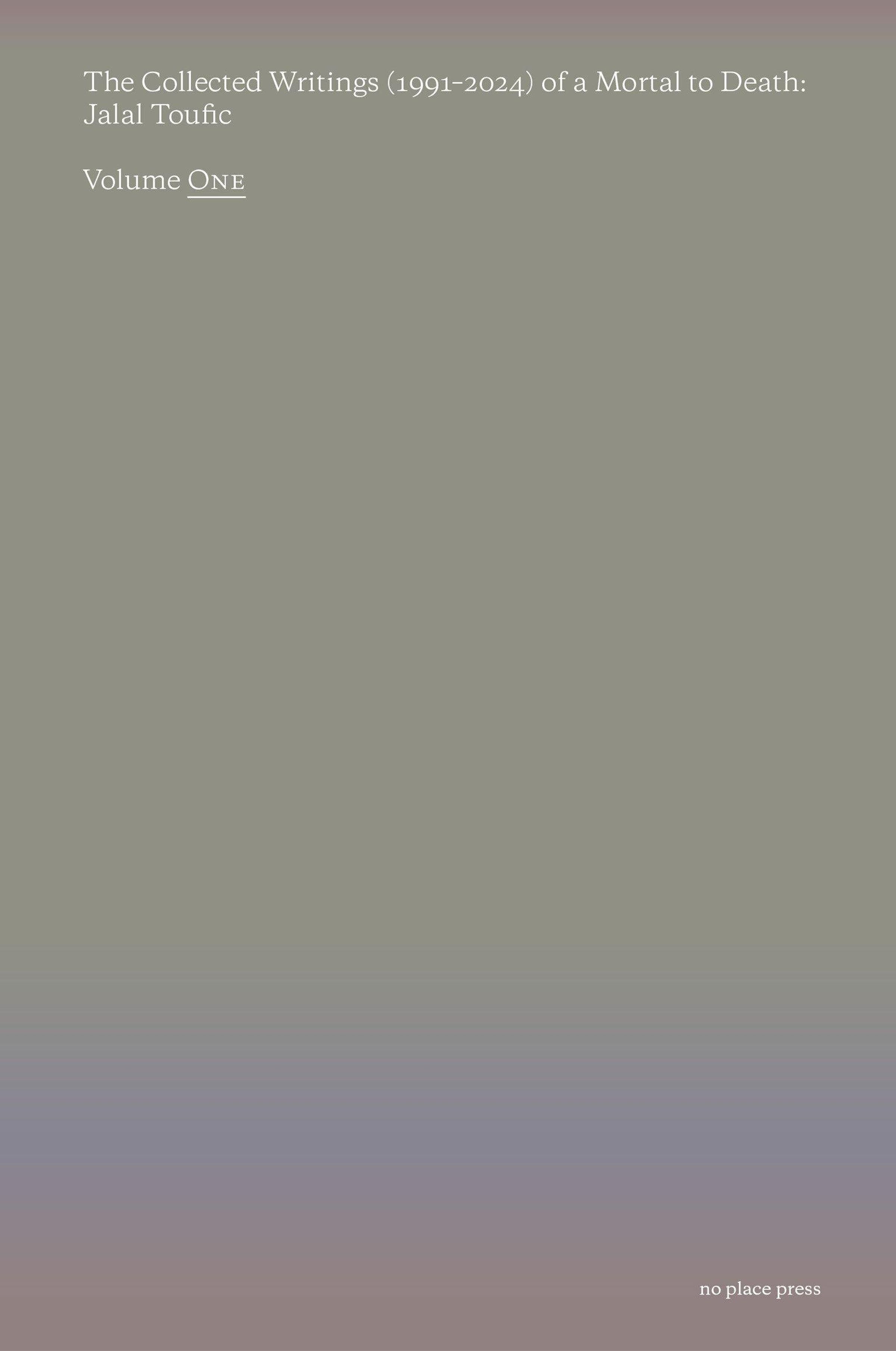 No Place Press is collaborating with Jalal Toufic on an ambitious publishing project: The Collected Writings (1991--2024) of a Mortal to Death: Jalal Toufic . Spanning three volumes of more than six hundred pages each, the series gathers re-edited versions of his earlier works alongside two newly written books, arranged and organized by the author himself. For new readers, the volumes provide an introduction to Toufic's central concepts---including the withdrawal of tradition past a surpassing disaster, radical closure, silence-over, the 180-degree over-turn, and the dancer's two bodies---while for longtime readers they offer a comprehensive view of more than three decades of thought, presented in their most rigorous and fully articulated form. Yet, in keeping with Toufic's practice---which participates in untimely collaboration (including with future filmmakers, thinkers, and artists) and abides in the suspension of the avenir of messianism / Mahdism---some of these works remain forthcoming even after their inclusion in the Collected Writings .