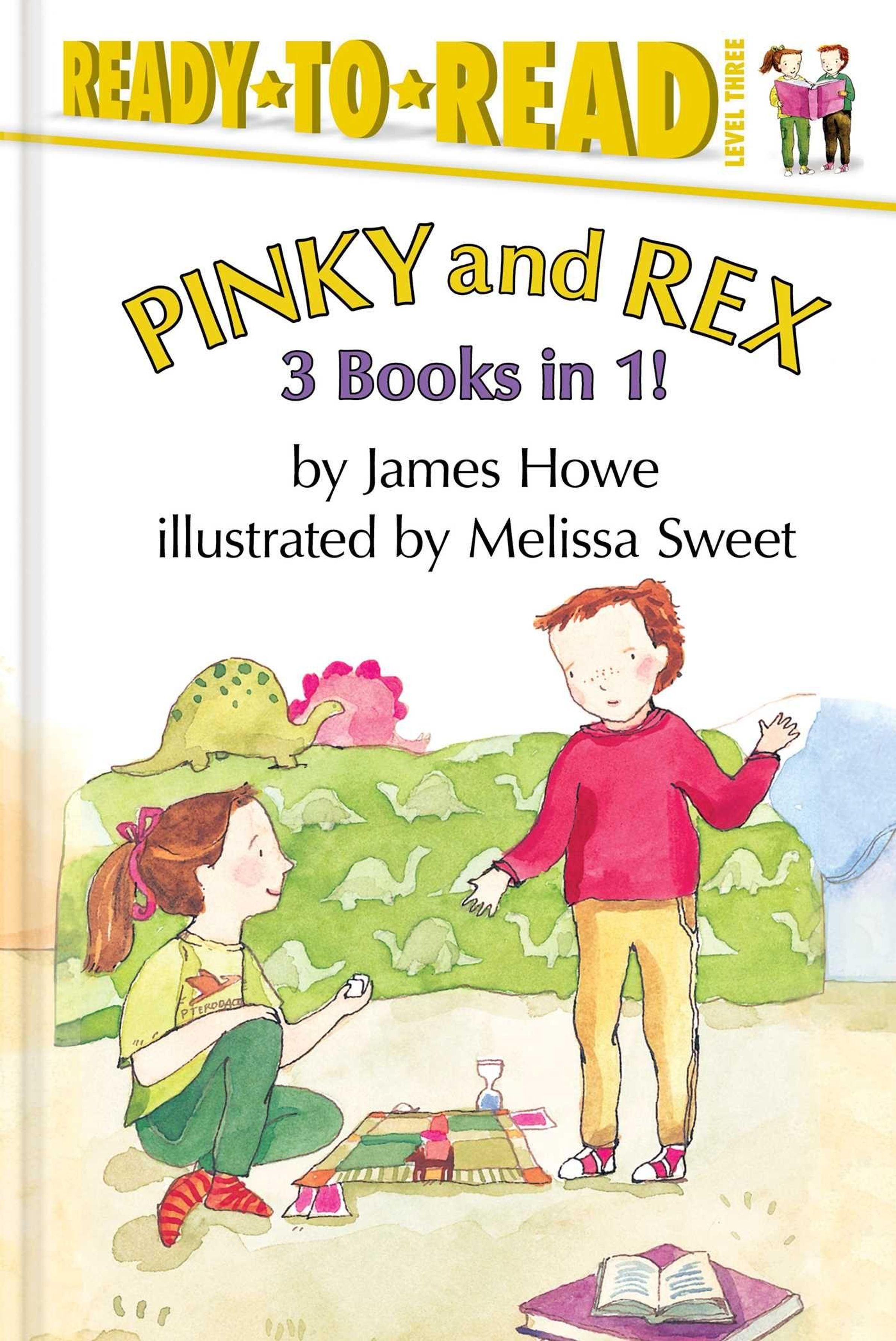 Text: "Pinky and Rex, 3 Books in 1! by James Howe, illustrated by Melissa Sweet." Zwei Kinder spielen auf einer Decke., Buch