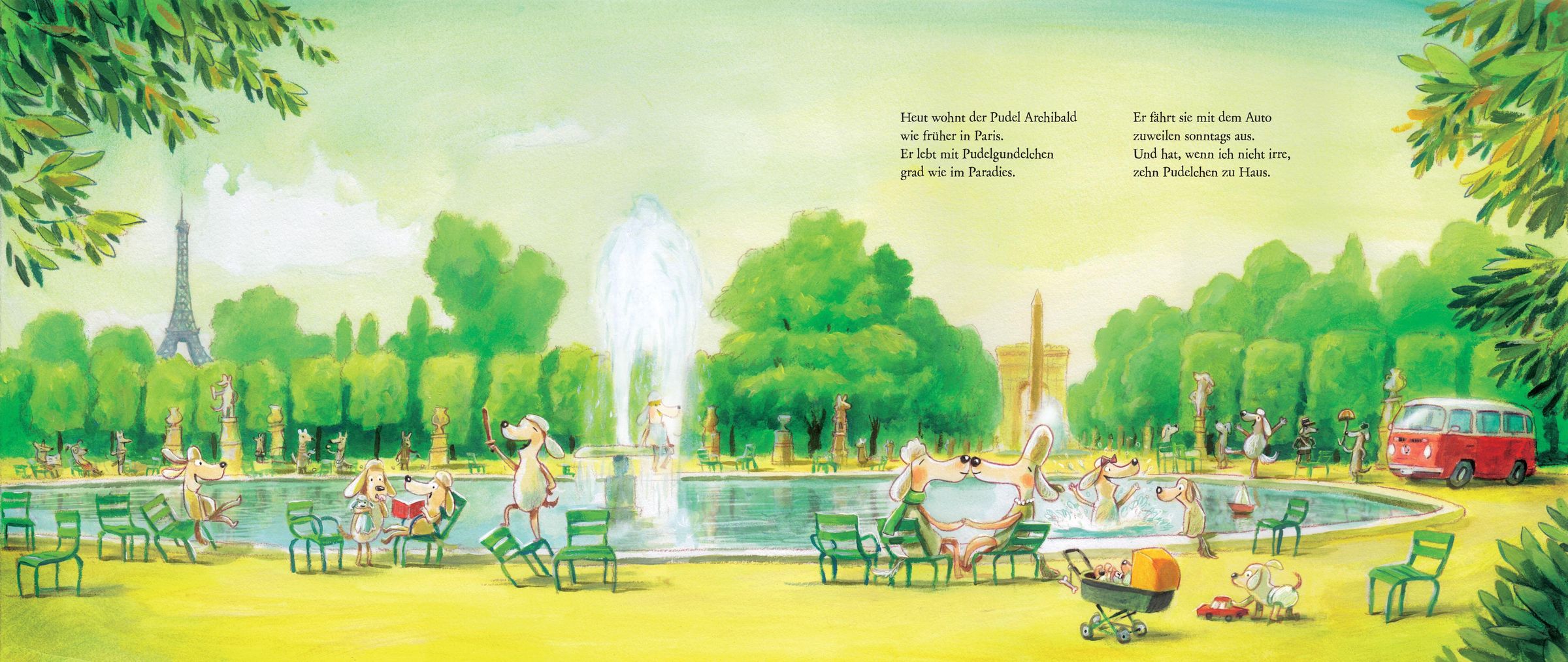 "Der Reisepudel Archibald", James Krüss, Günther Jakobs. Illustration: Ein Pudel fährt Auto in Paris, Eiffelturm im Hintergrund., Buch