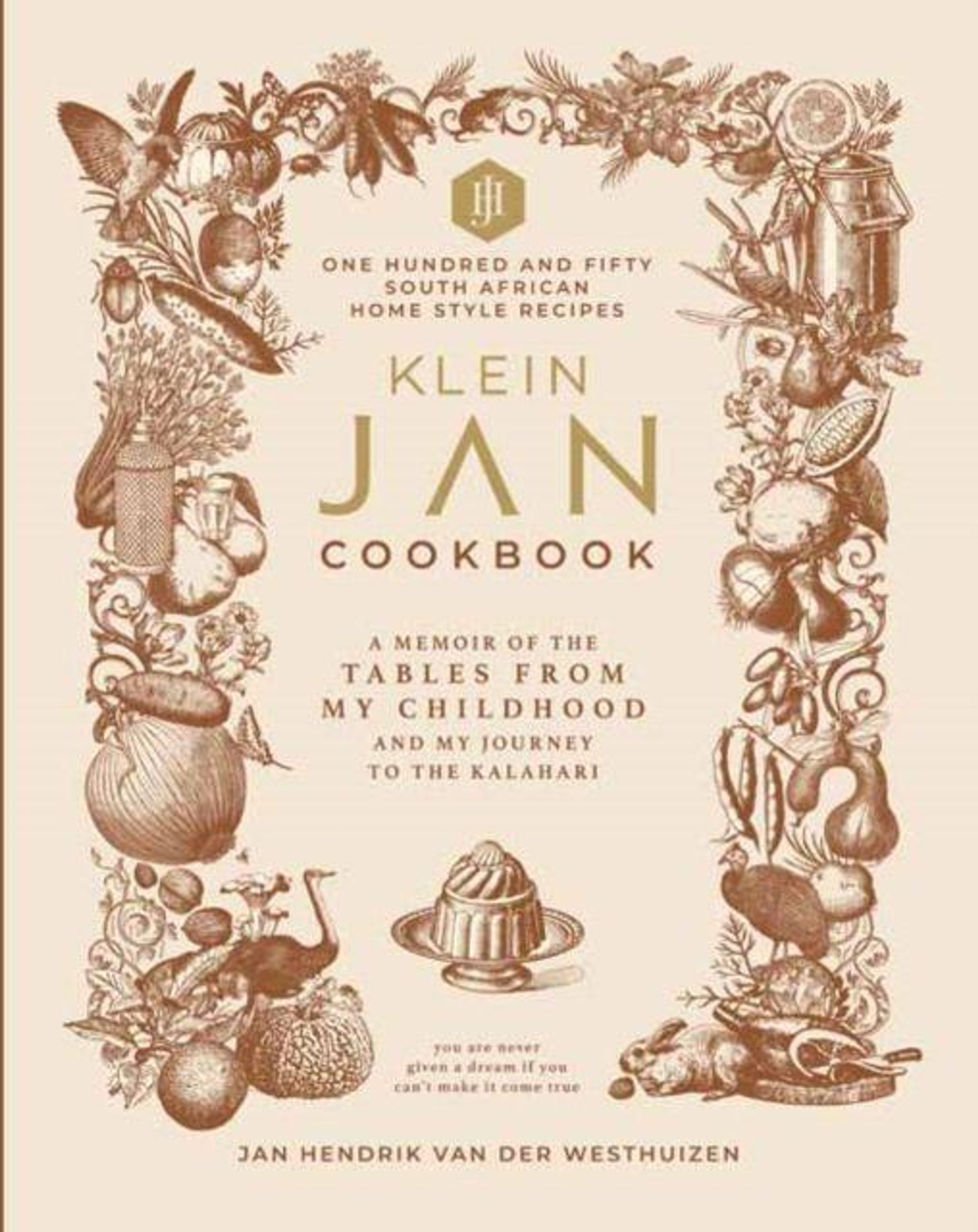 "Klein Jan Cookbook" mit 150 südafrikanischen Rezepten, Kindheitserinnerungen, Kalahari-Reise. Illustrierte Lebensmittelränder., Buch
