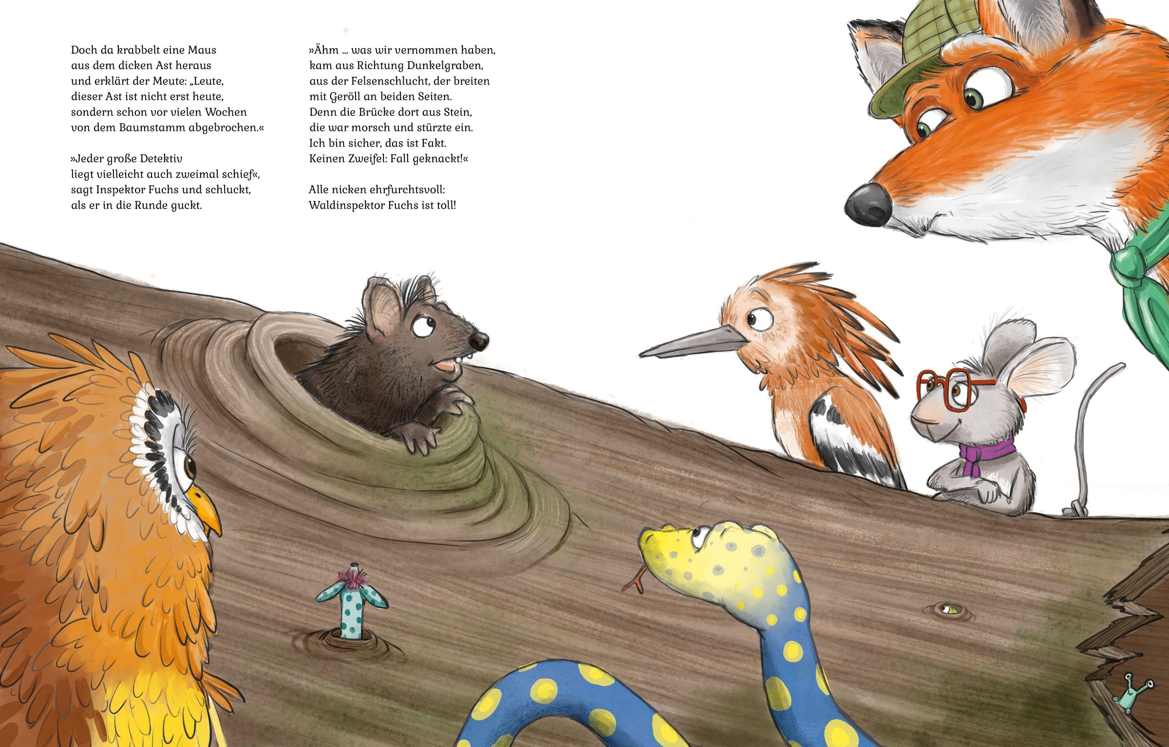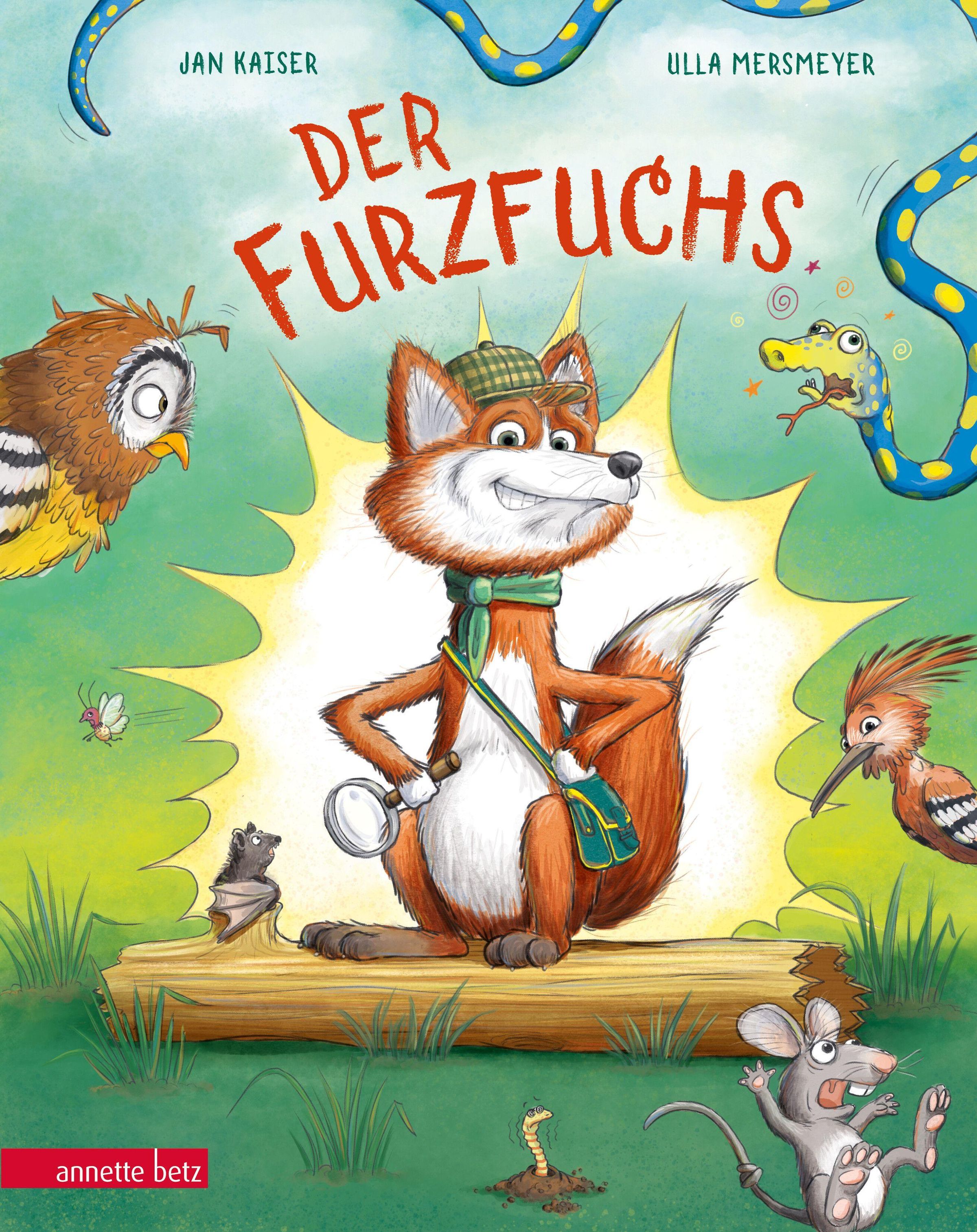 „DER FURZFUCHS“ steht groß in Rot. Ein Fuchs mit Detektivhut und Lupe wird von Tieren überrascht angeschaut., Buch