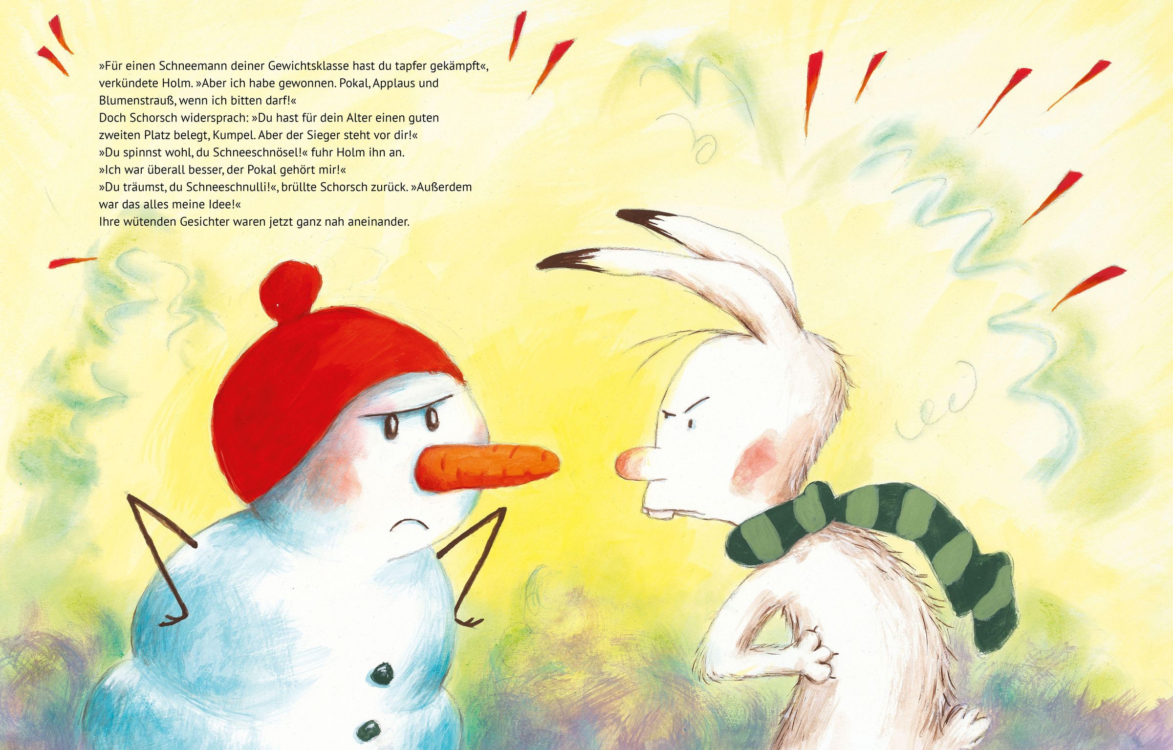 Es gibt Streit bei Schneemann Schorsch und Schneehase Holm, obwohl sie doch allerbeste Freunde sind. Aus einer guten Idee - Schneeolympiade! -, wurde ein großer Krach. Beide sehen sich als Gewinner! Aber als Schorsch und Holm dann schmollend im Schnee sitzen, werden sie doch traurig ... und merken, dass es gar nicht so leicht ist, sich nach einem Streit wieder zu vertragen. Mit etwas Mut und Fantasie schaffen es die zwei, wieder aufeinander zuzugehen. Und erleben am Ende noch eine große Überraschung!