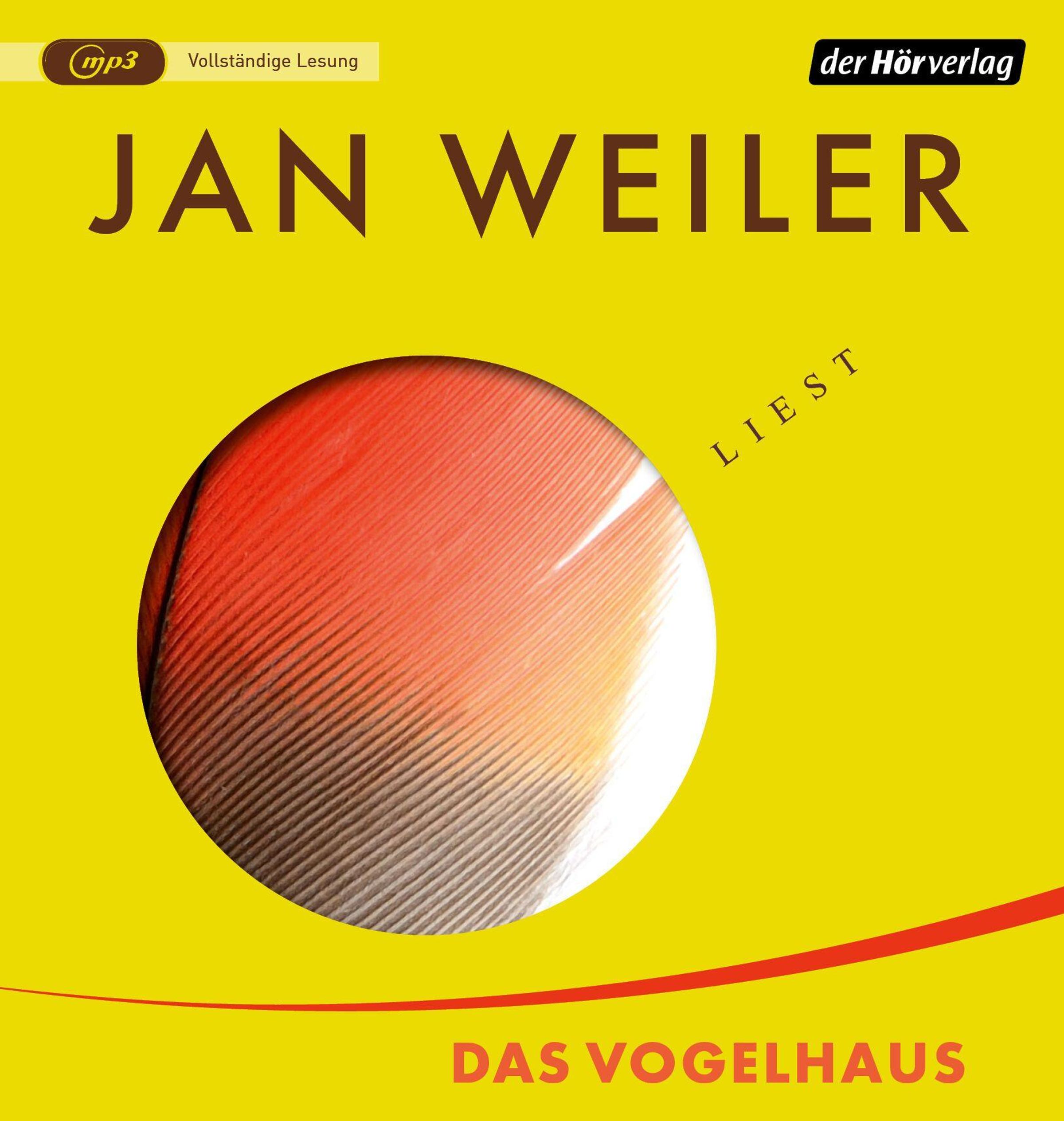 „Vollständige Lesung“, „JAN WEILER LIEST“, „DAS VOGELHAUS“. Gelbes CD-Cover mit rundem Fenster und Feder-Design., MP3-CD