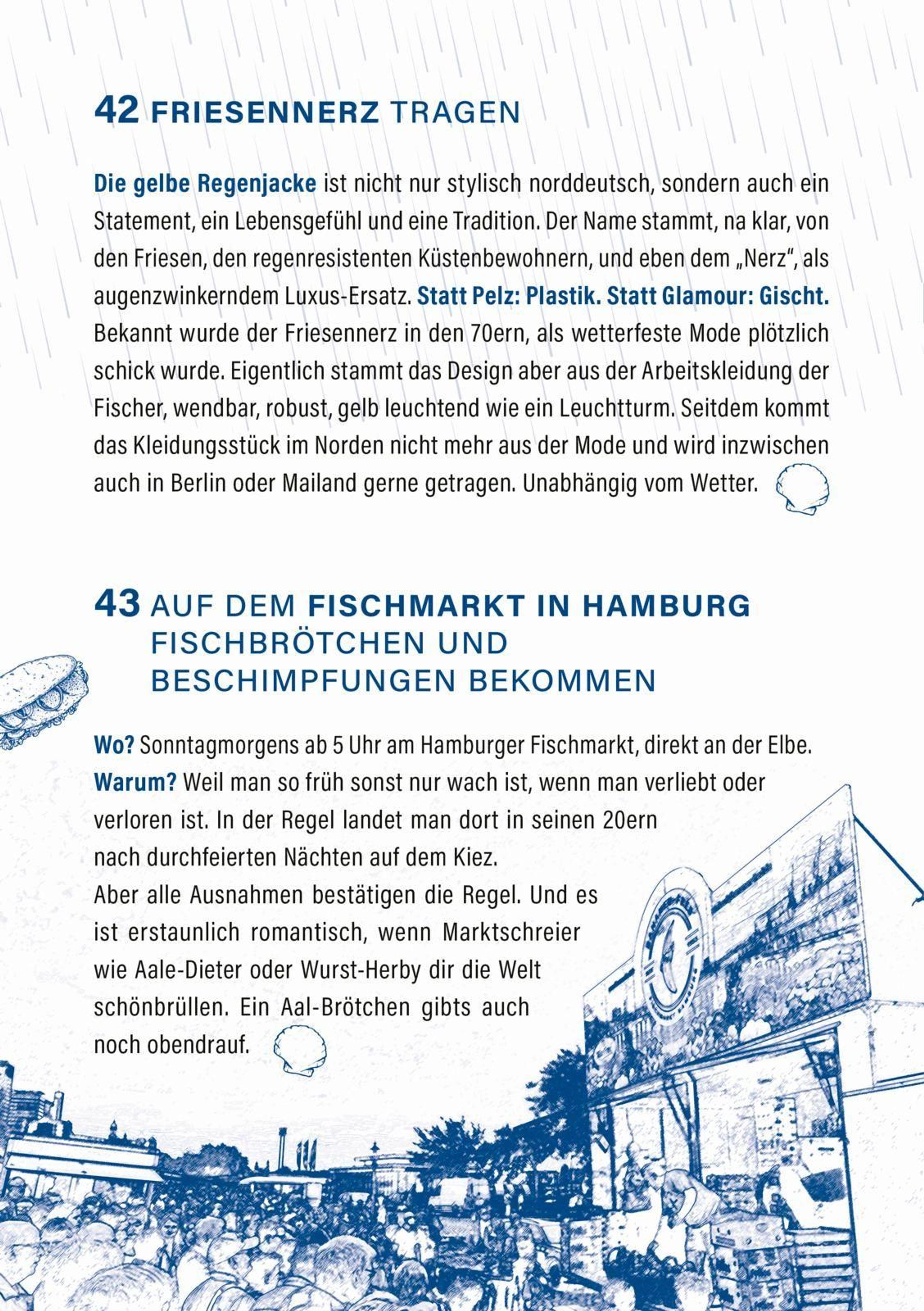 Mit einer Mischung aus Humor, Charme und norddeutscher Gelassenheit lädt dieses Buch ein, die lustigsten Aktivitäten, authentischsten Orte und skurrilsten Traditionen des Nordens zu entdecken und erleben. Ob Labskaus probieren, an einer Kohlfahrt teilnehmen oder sich auf dem Hamburger Fischmarkt von Aale-Dieter anschreien lassen - **hier wird der wahre Norden gefeiert.**Ein Muss für alle, die ihn lieben oder kennenlernen wollen!
