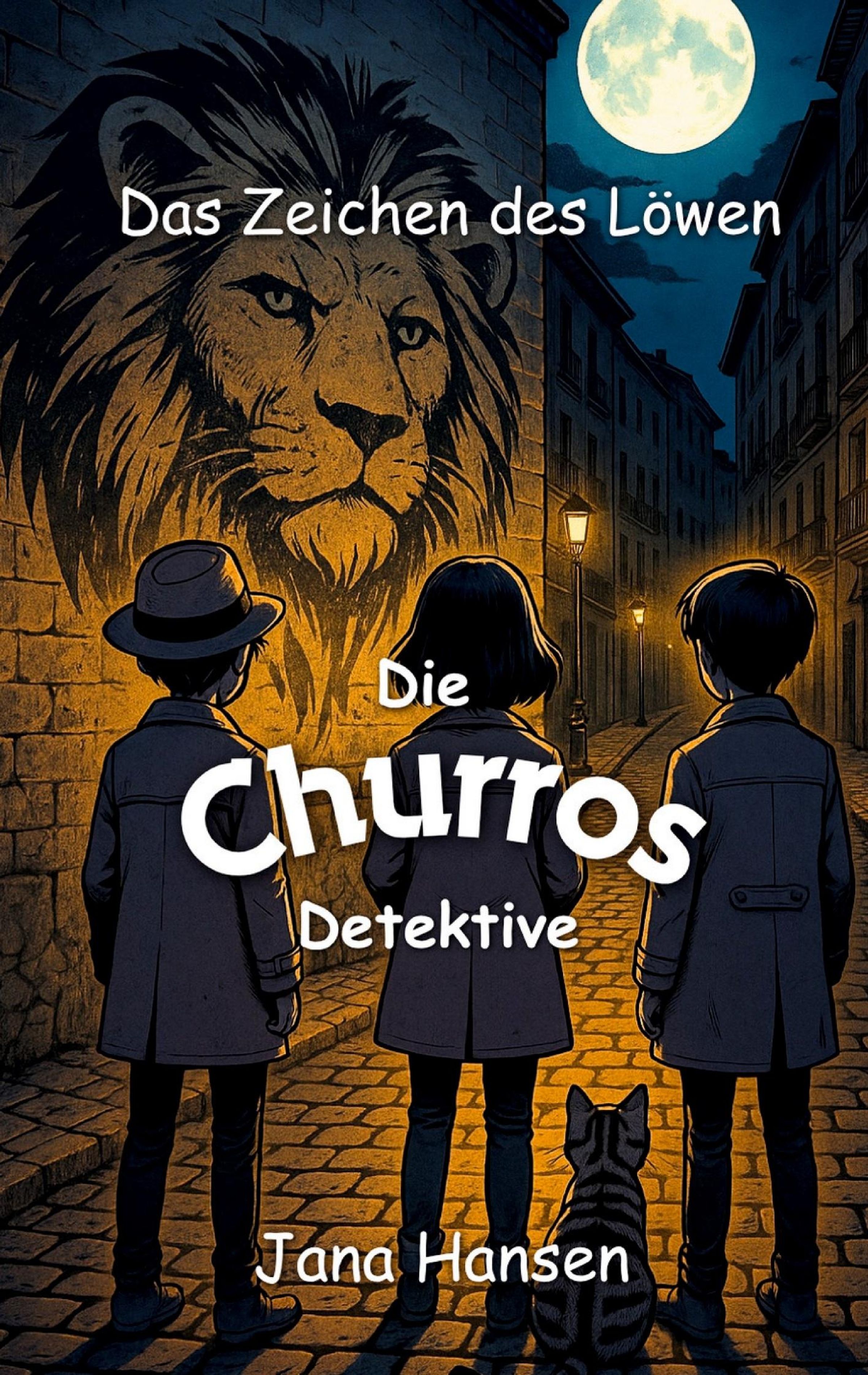 "Das Zeichen des Löwen. Die Churros Detektive. Jana Hansen." Drei Kinder und eine Katze betrachten ein Löwen-Wandbild., Buch
