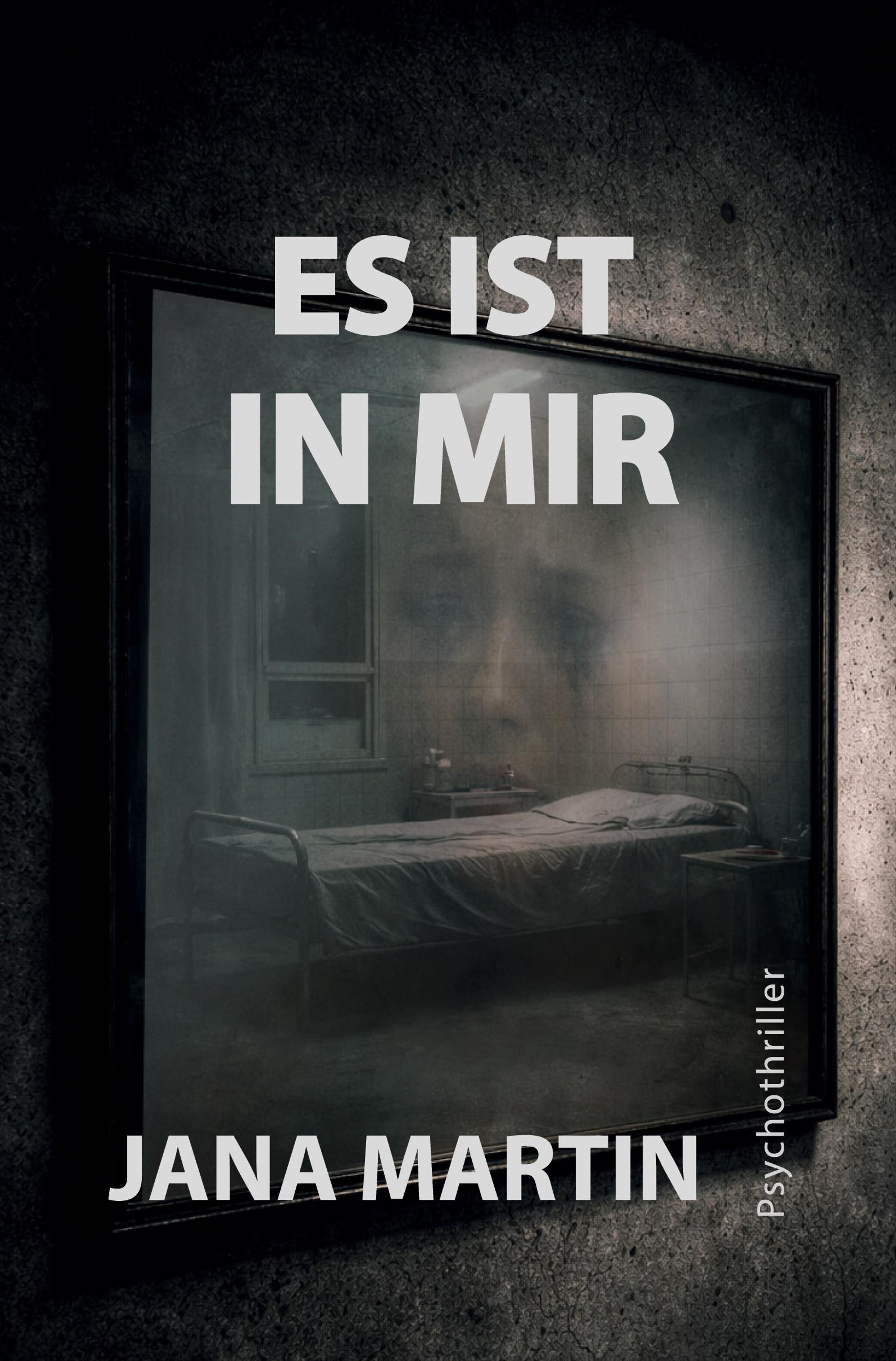 Text: "ES IST IN MIR", "JANA MARTIN", "Psychothriller". Ein dunkler, düsterer Raum mit Bett., Buch