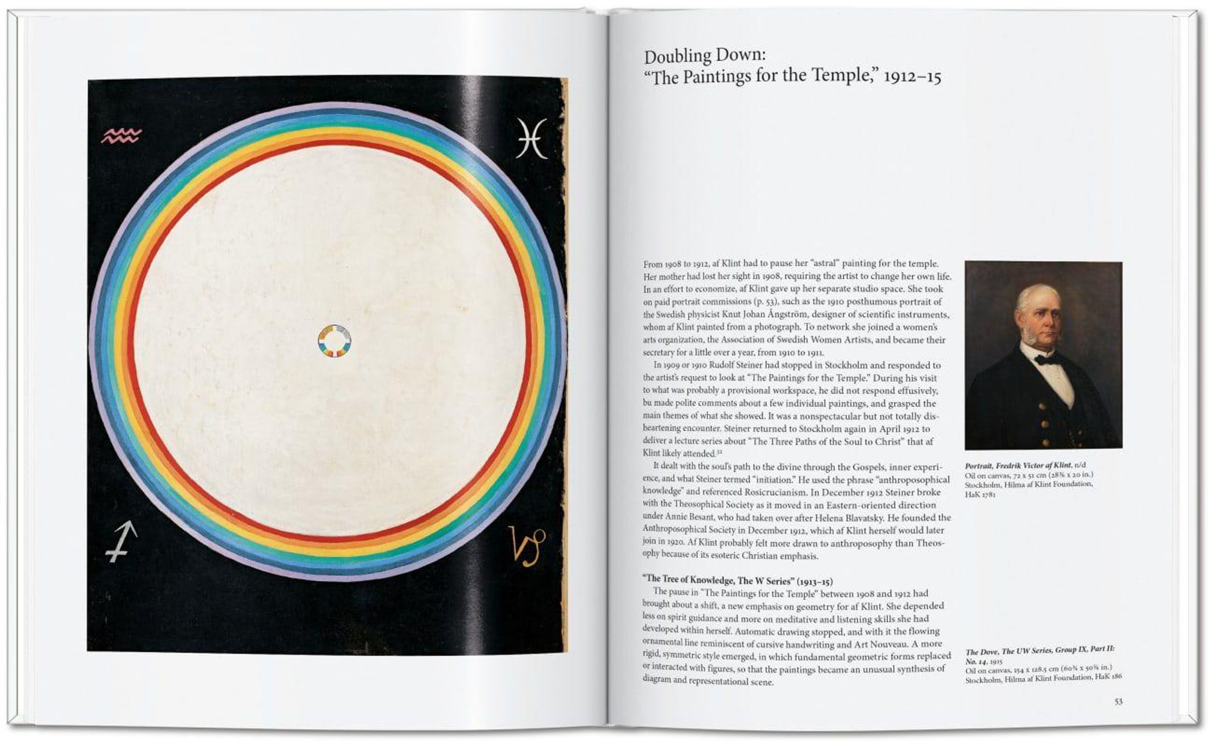 Bis 1906 zeigten ihre Leinwände strahlenförmige Geometrien aus Spiralen und Kugeln, reich an Symbolen, Buchstaben und Wörtern, die die spätere Hinwendung zur Abstraktion von Kandinsky, Malewitsch, Mondrian und anderen vorwegnahmen. Ihre umfangreichen Gemäldezyklen - großformatigen Serie Malereien für den Tempel - stellten oft Dualitäten dar: Innen und Außen, das Irdische und das Esoterische, Mann und Frau, Gut und Böse.