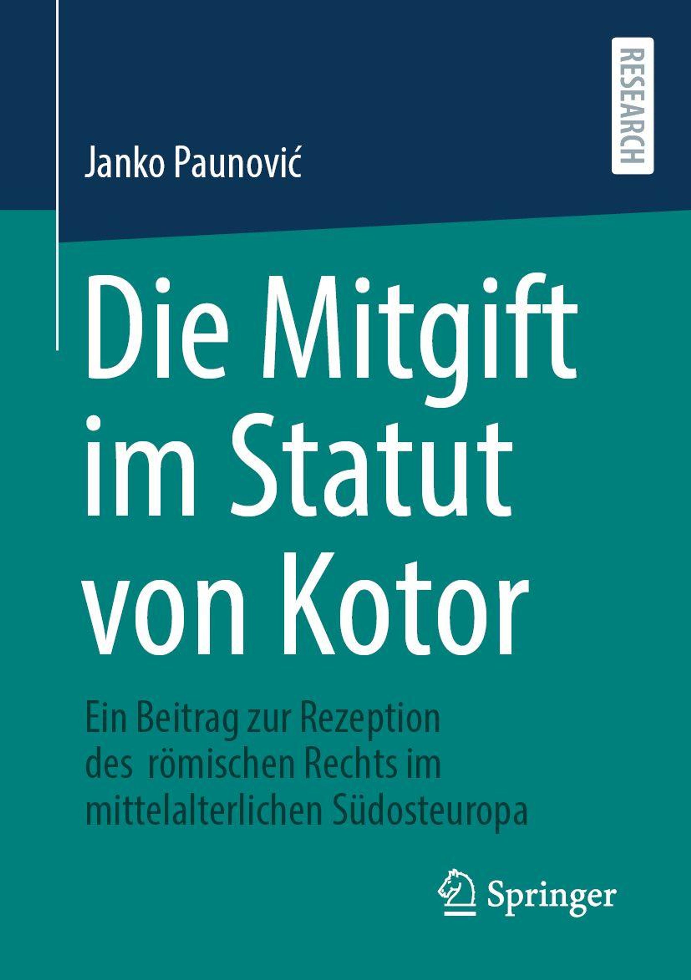 Text: Janko Paunović, Die Mitgift im Statut von Kotor, Ein Beitrag zur Rezeption des römischen Rechts im mittelalterlichen Südosteuropa. Links oben dunkelblauer Hintergrund, weiße Schrift. Unten türkisfarbener Hintergrund mit weißem Springer-Logo., Buch