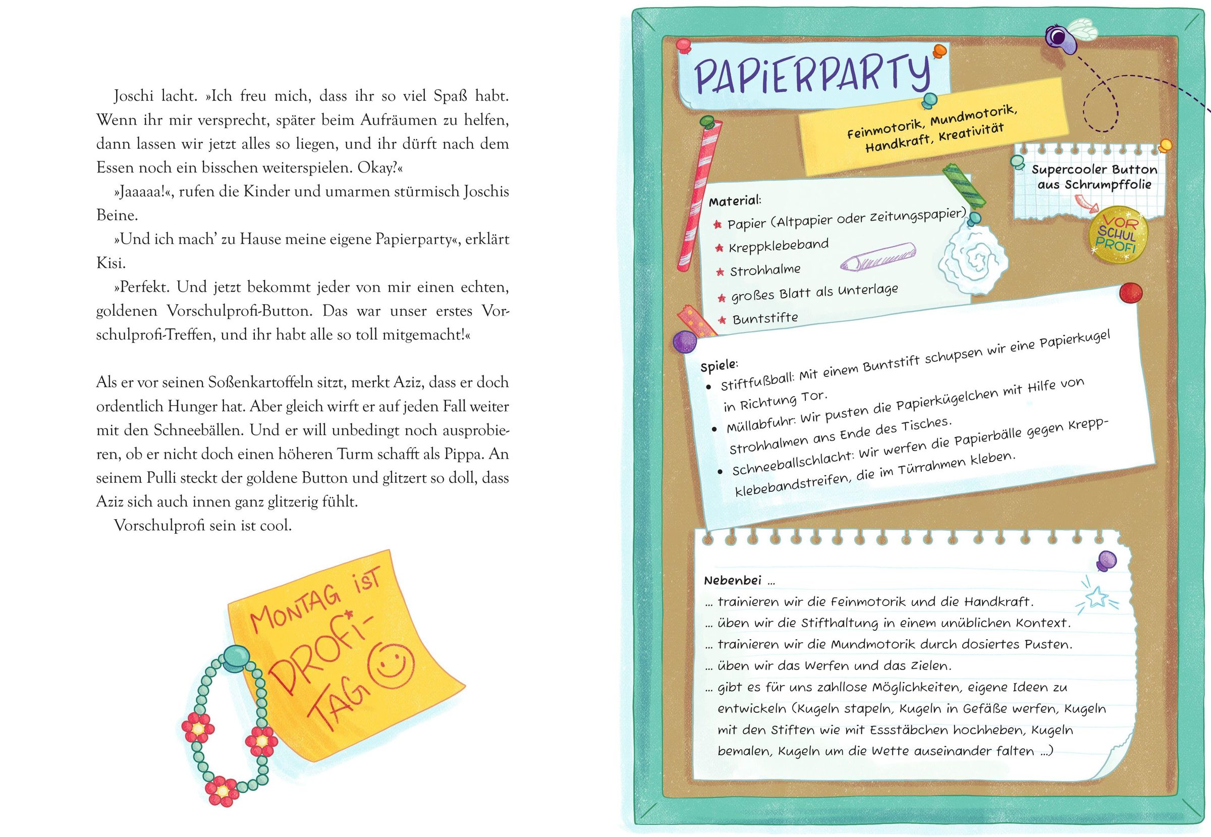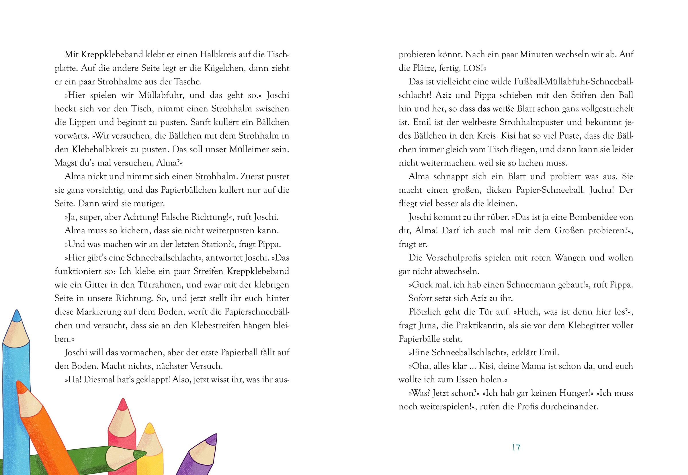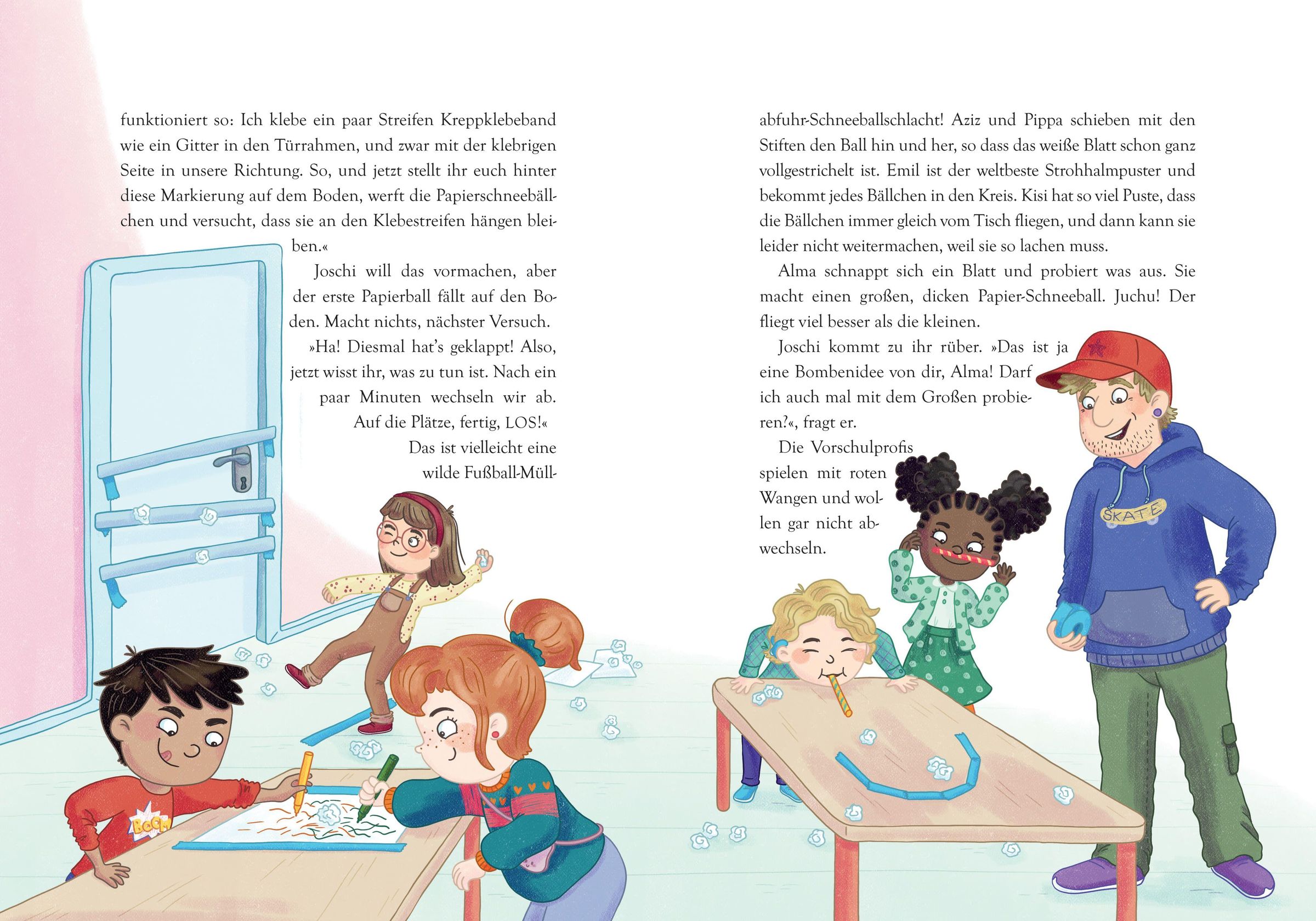 Pippa, Aziz, Emil, Kisi und Alma sind jetzt die Großen in der Kita Kichererbse - und jeden Montag ist Vorschulgruppe. Gemeinsam mit Erzieher Joschi feiern sie eine Papierparty, besuchen zum allerersten Mal die Schule und basteln Freundefindebälle. Die Vorschulzeit ist richtig toll, denn es gibt so viel Neues zu entdecken, und die Vorschulprofis merken: Wir können schon jede Menge! Doch auch, wenn die Vorfreude auf die Schule groß ist ... Abschiednehmen und neue Freunde finden ist womöglich gar nicht so leicht. Zum Glück gibt es Tipps und Tricks und eine Vorschulgruppe, die zusammenhält!