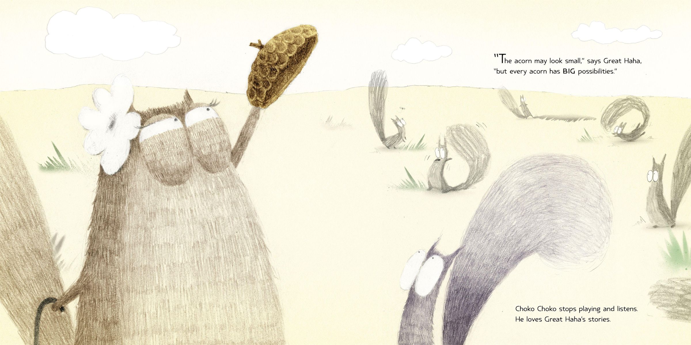 When Choko Choko discovers the largest acorn he has ever seen, he remembers Great Haha's wise words... and he realizes that although he's small, he can dare to dream big.