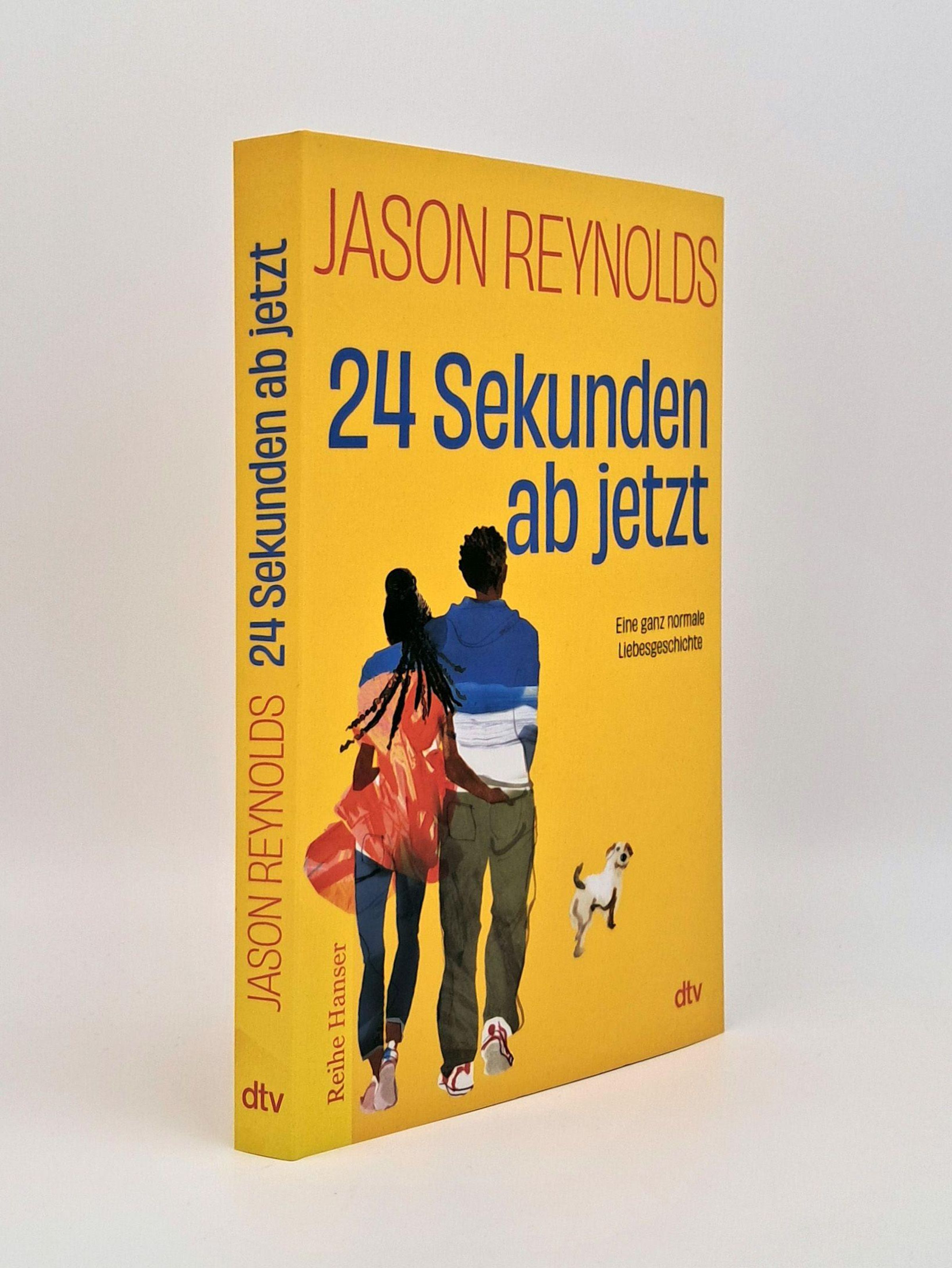 „24 Sekunden ab jetzt“ von Jason Reynolds. Eine Illustration zeigt ein Paar von hinten und einen kleinen Hund., Buch