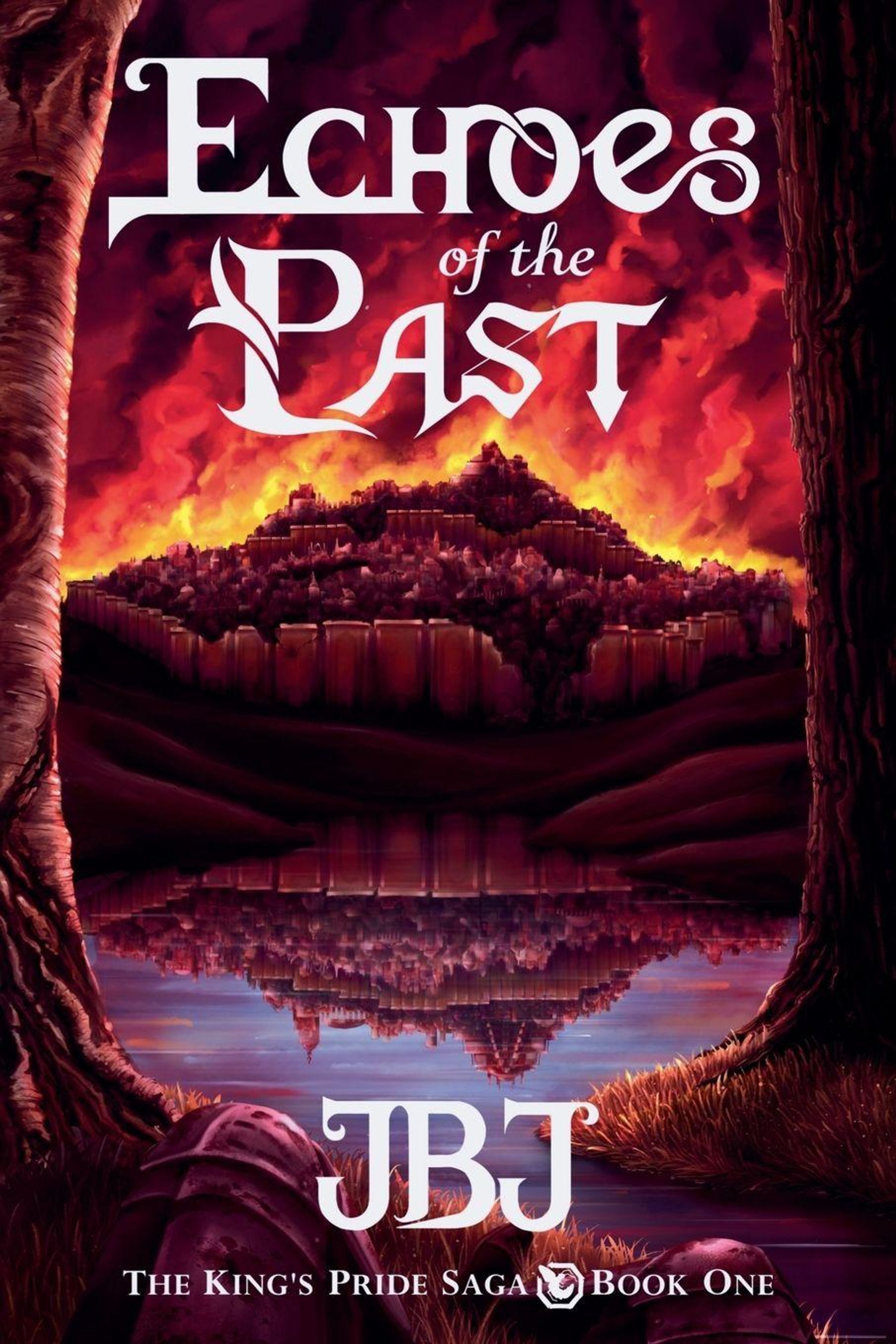 "Echoes of the Past", "JBJ", "The King's Pride Saga Book One". Eine Burg vor einem brennenden Himmel mit Spiegelung im Wasser., Buch