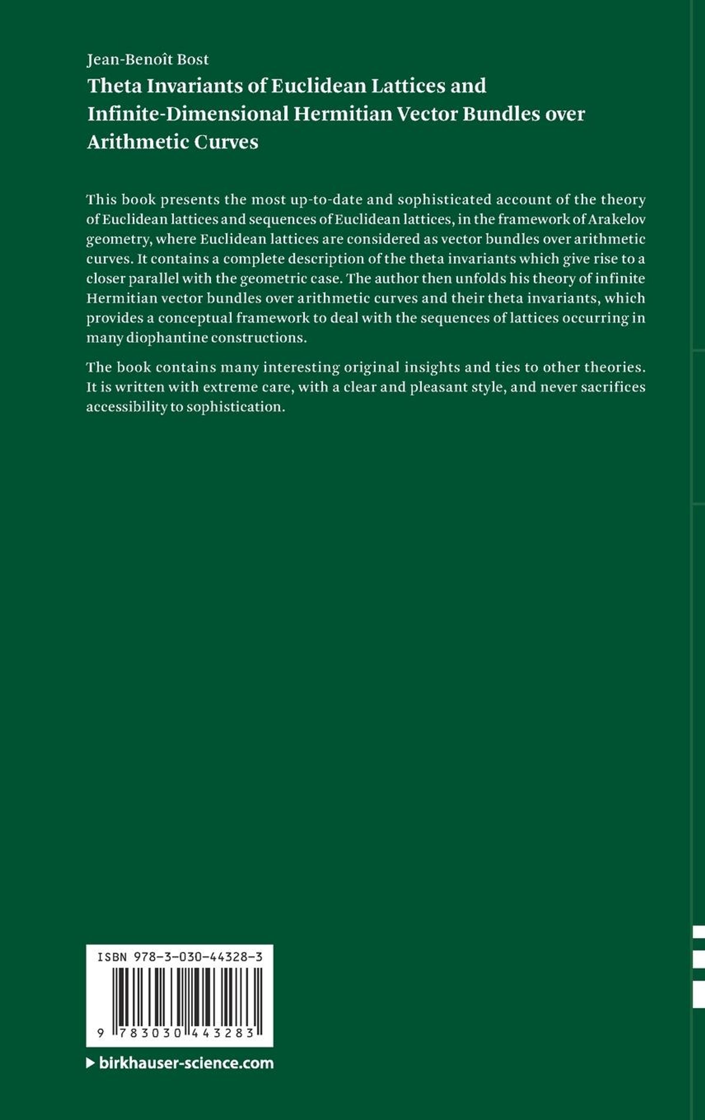 This book presents the most up-to-date and sophisticated account of the theory of Euclidean lattices and sequences of Euclidean lattices, in the framework of Arakelov geometry, where Euclidean lattices are considered as vector bundles over arithmetic curves. It contains a complete description of the theta invariants which give rise to a closer parallel with the geometric case. The author then unfolds his theory of infinite Hermitian vector bundles over arithmetic curves and their theta invariants, which provides a conceptual framework to deal with the sequences of lattices occurring in many diophantine constructions.