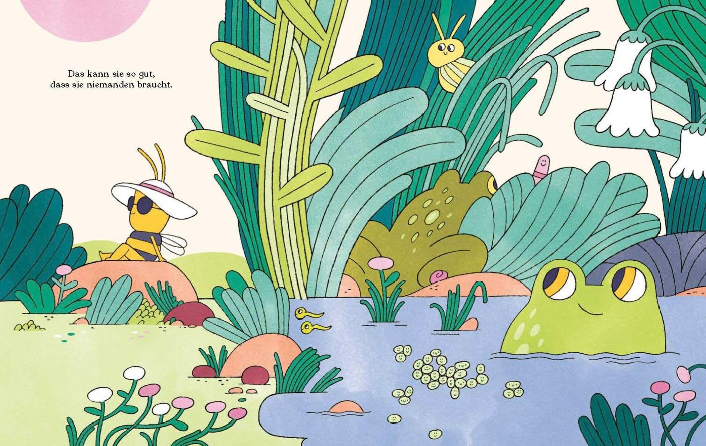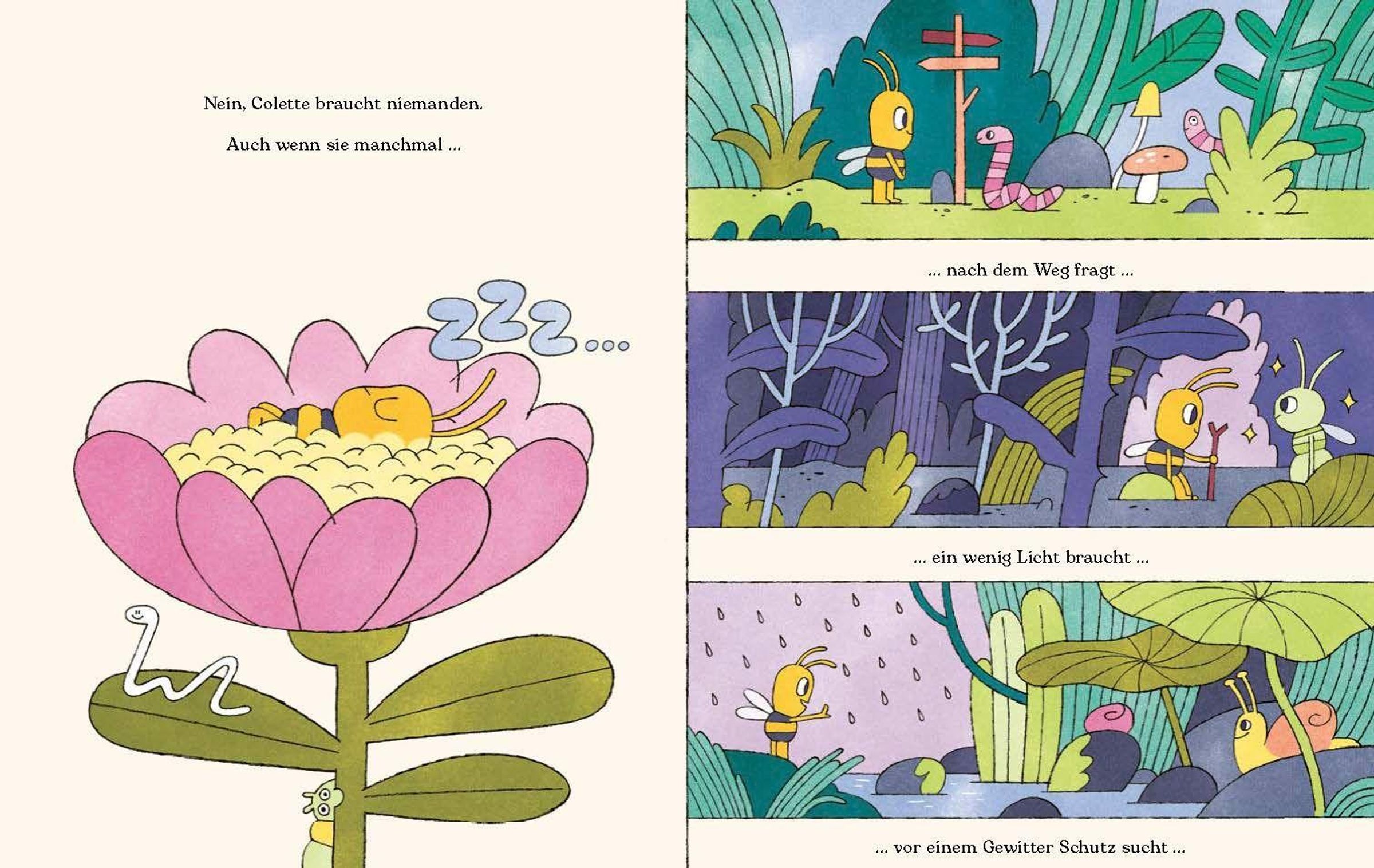 Colette ist eine kleine Biene, die (fast) alles kann: fliegen, Pollen sammeln, reisen und für sich selbst sorgen. Sie ist stolz darauf, alles allein zu schaffen - schließlich braucht sie niemanden! Doch wenn der Wald plötzlich fremd wird, ein Gewitter aufzieht oder die Nacht besonders dunkel ist, merkt Colette: Alleinsein ist toll - aber Hilfe anzunehmen kann genauso mutig sein. Und als sie selbst jemandem beisteht, entdeckt sie das Schönste überhaupt: das warme Gefühl, gemeinsam stark zu sein. Ein charmantes, klug illustriertes Bilderbuch über Selbstvertrauen, Freundschaft und das Glück, nicht alles allein schaffen zu müssen.