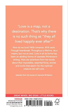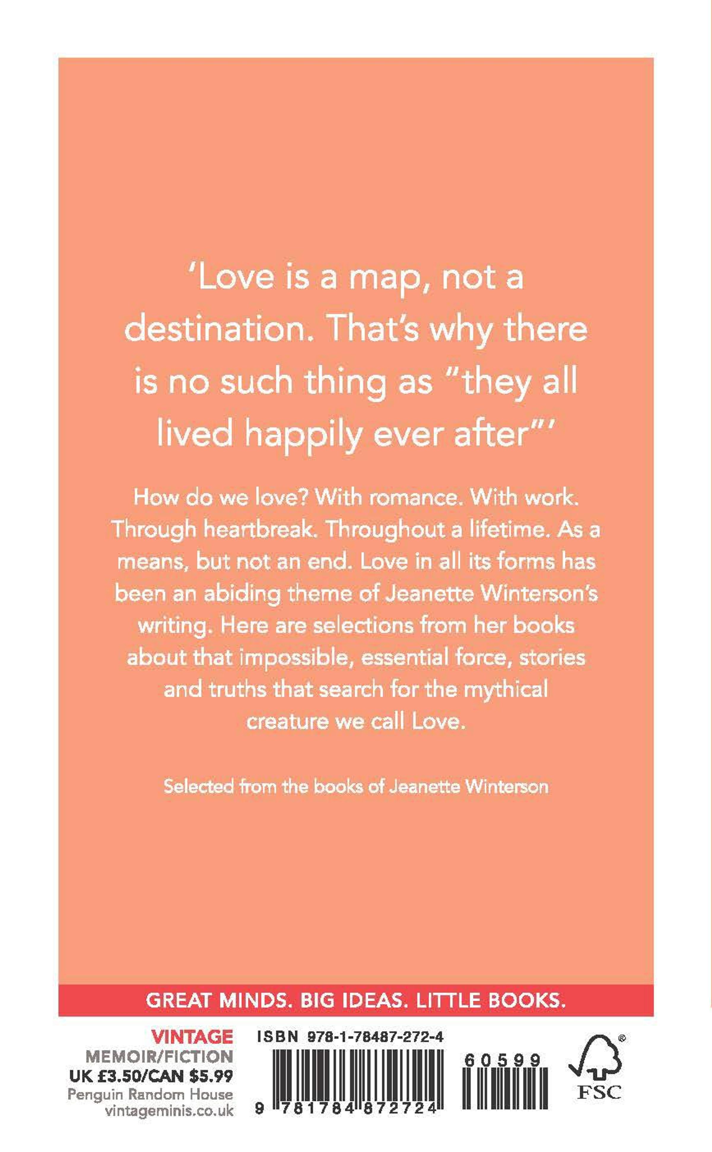 How do we love? With romance. With work. Through heartbreak. Throughout a lifetime. As a means, but not an end. Love in all its forms has been an abiding theme of Jeanette Winterson's writing. Here are selections from her books about that impossible, essential force, stories and truths that search for the mythical creature we call Love. Selected from the books of Jeanette Winterson. VINTAGE MINIS: GREAT MINDS. BIG IDEAS. LITTLE BOOKS. A series of short books by the world's greatest writers on the experiences that make us human. Also in the Vintage Minis series: Eating by Nigella Lawson; Jealousy by Marcel Proust; Babies by Anne Enright; and, Desire by Haruki Murakami.