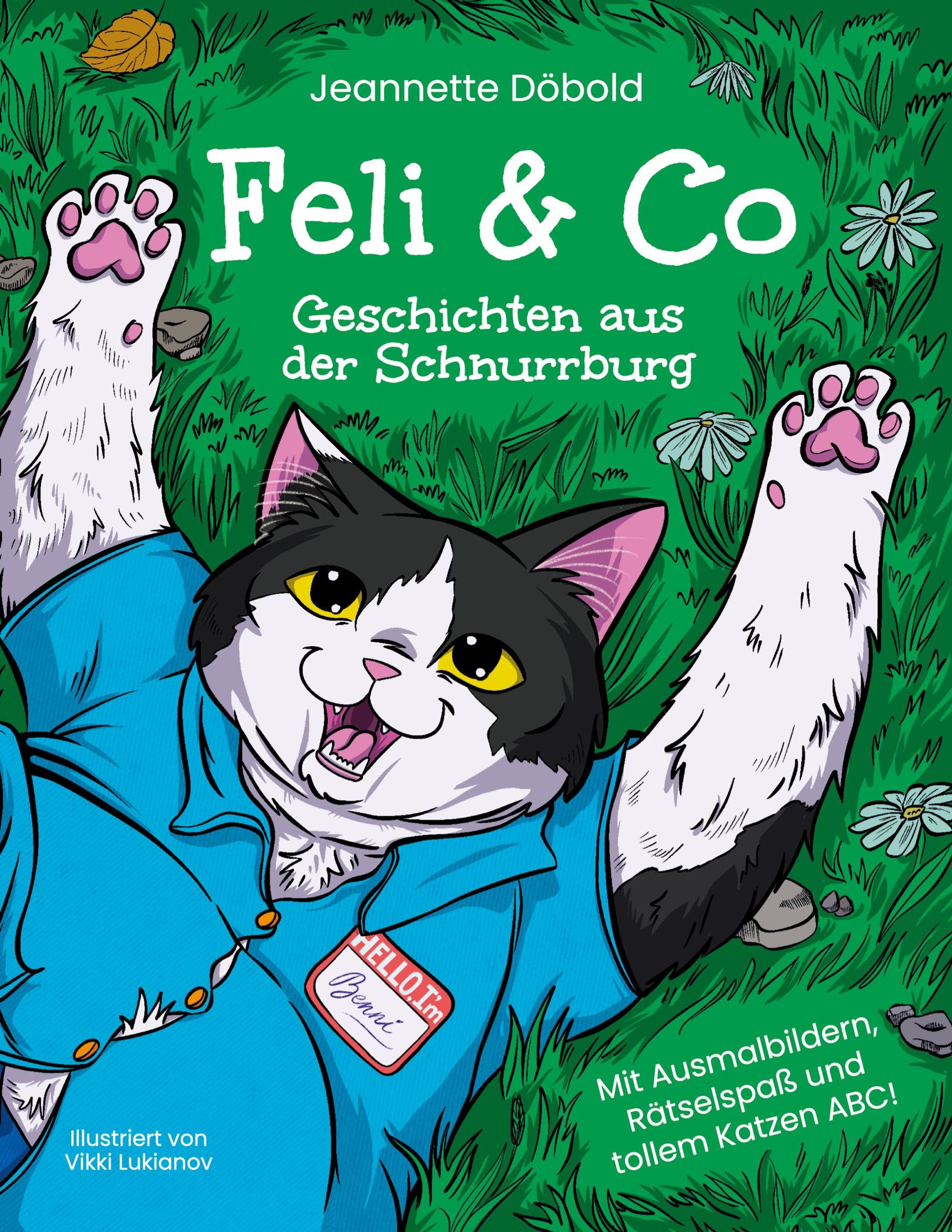 Ein fröhlicher schwarz-weißer Kater namens Benni in blauem Hemd liegt auf grünem Gras mit Blumen und hebt die Pfoten., Buch