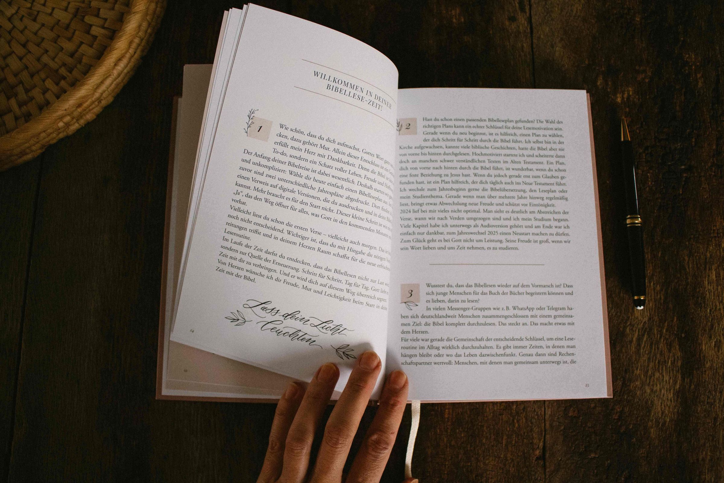 Mit inspirierenden Fragen, übersichtlichen Bibelleseplänen und kunstvoll kalligrafierten Bibelversen.