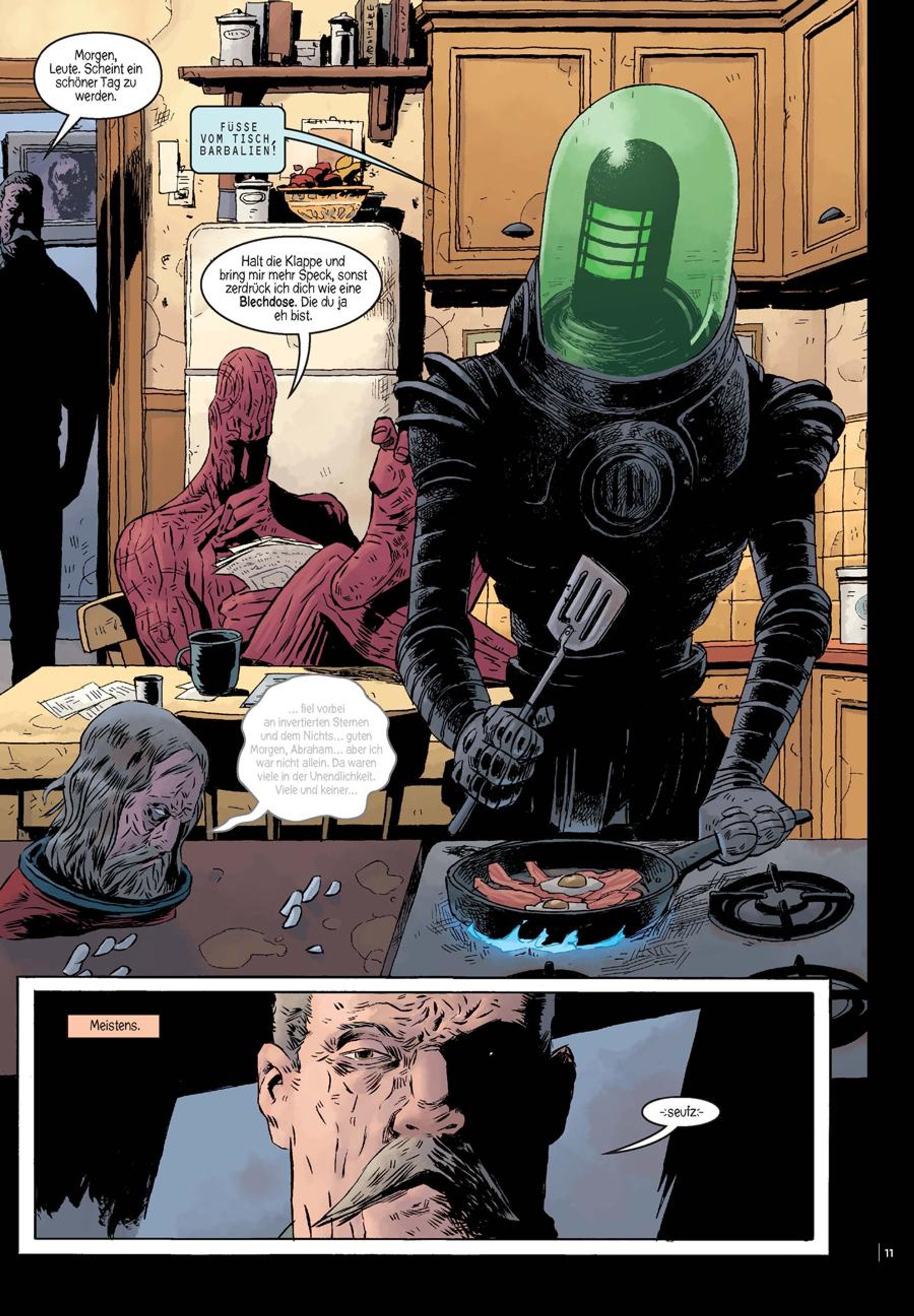 Jeff Lemire, der kanadische Spezialist für ausgefallene Stories mit Tiefgang (Descender, Der Unterwasser-Schweißer, Essex County), erschafft mit "Black Hammer" eine Hommage an die großen Superhelden der Comicgeschichte, bei der die Liebe zum Genre aus jeder Seite strahlt. Und gleichzeitig ist die Serie ein Abgesang auf die Naivität moderner Superhelden, der ohne die bekannten Klischees von moralisch zerrissenen Antihelden und Rächern wider Willen auskommt. Die Zeichnungen von Dean Ormston, der mit Neil Gaiman an "Sandman" gearbeitet hat und dessen Spin-Off "Lucifer" zeichnet, wirken gleichermaßen vertraut und fremdartig und reflektieren die innere Spannung von Lemires Vision perfekt.