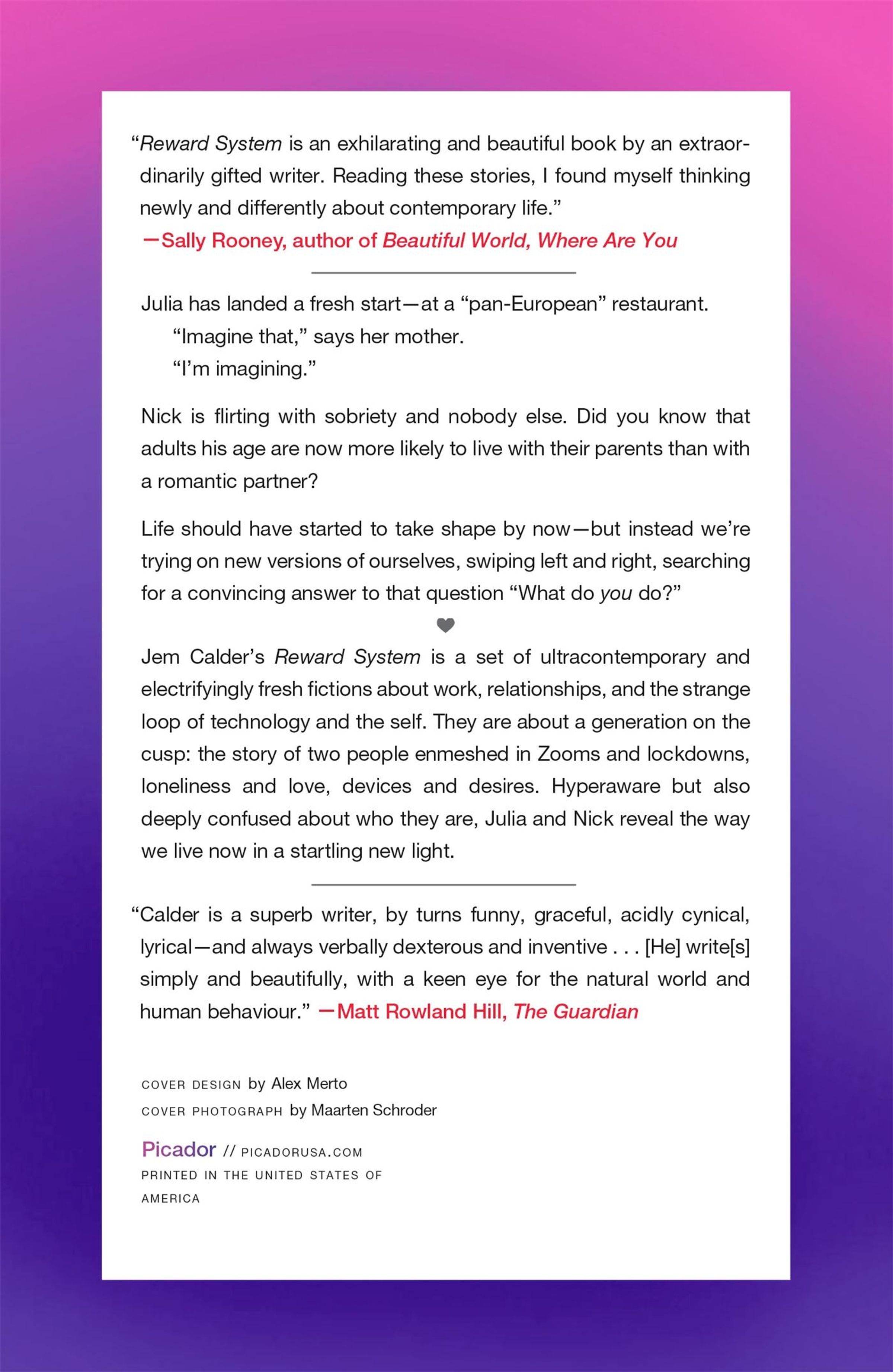Jem Calder's Reward System is a set of ultracontemporary and electrifyingly fresh fictions about work, relationships, and the strange loop of technology and the self. They are about a generation on the cusp: the story of two people enmeshed in Zooms and lockdowns, loneliness and love, devices and desires. Hyperaware but also deeply confused about who they are, Julia and Nick reveal the way we live now in a startling new light.