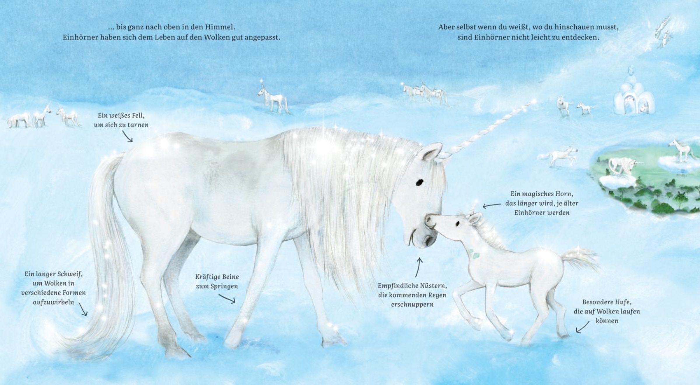 Text: "Das geheime Leben der Einhörner" von Jenni Desmond. Illustration: Zwei weiße Einhörner auf Wolken vor blauem Himmel., Buch