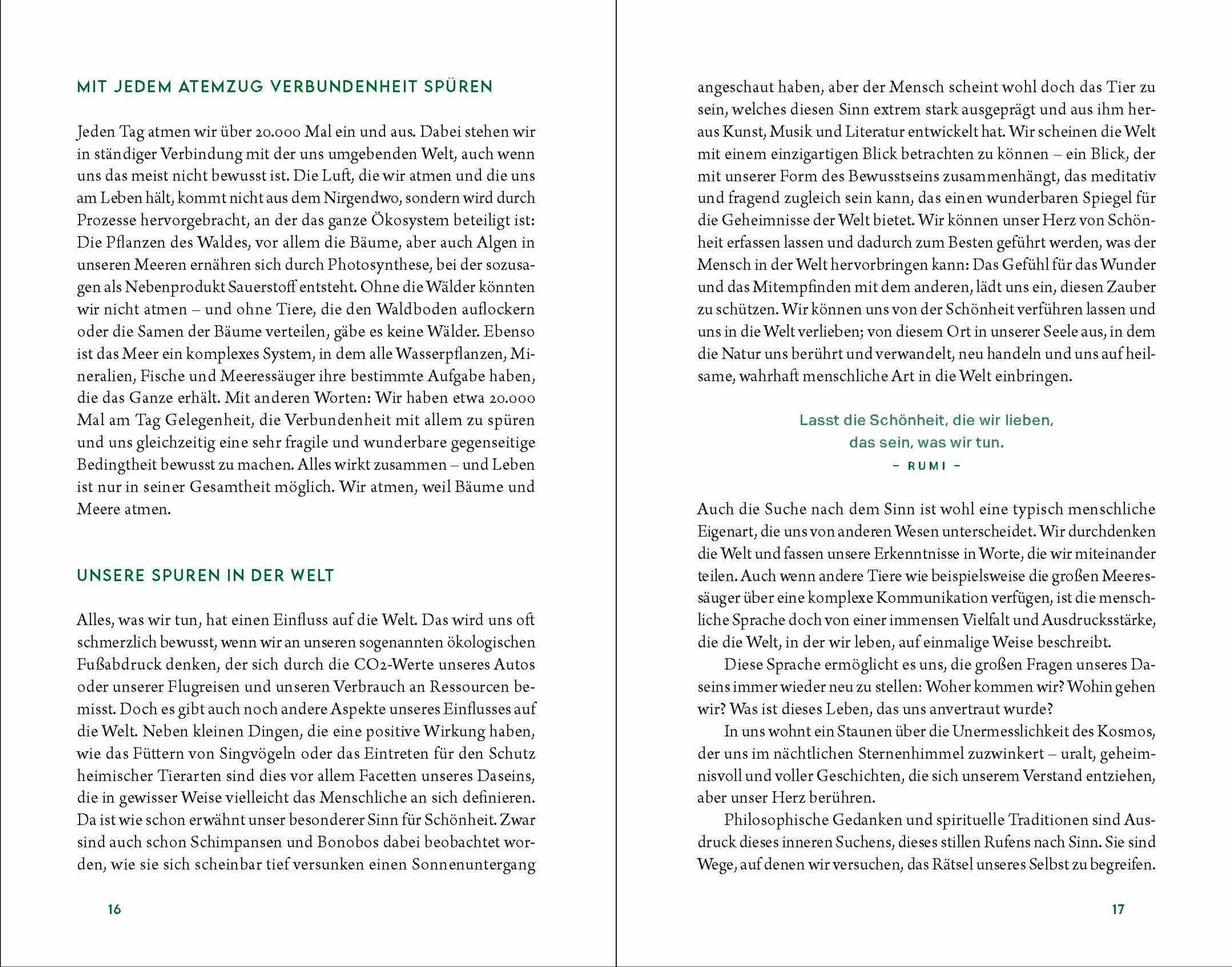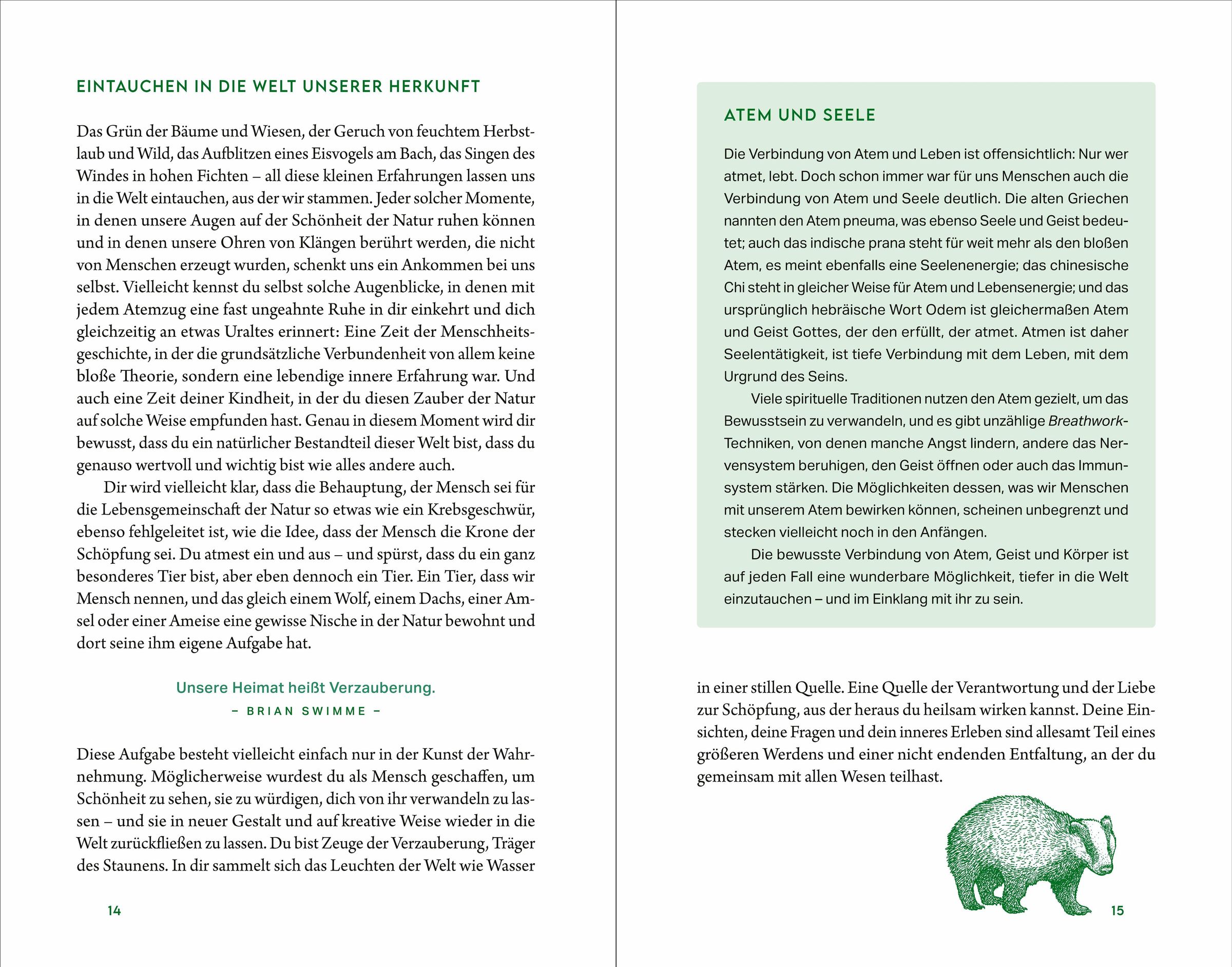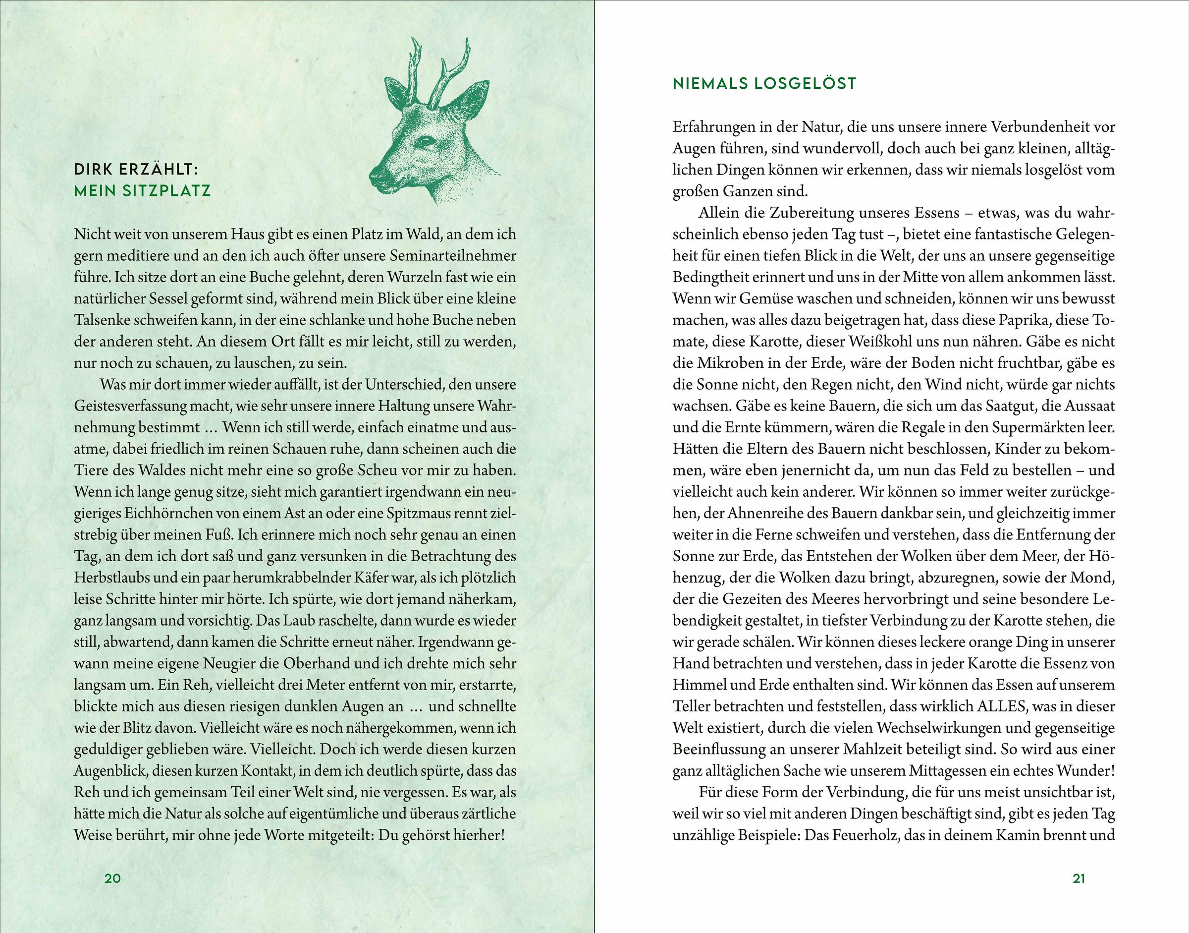 Wälder, Berge, Seen und Flüsse, das wilde Meer, das Grün der Bäume und das Singen des Windes, die Schönheit der Tiere und der ursprünglichen Landschaft - in der Natur findet unsere Seele Heimat, hier sind wir aufgehoben und geborgen. Sie ist Balsam für unsere stressgeplagte Zeit und der Ort, an dem sich unser Herz wie von selbst öffnen kann.