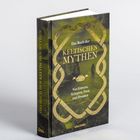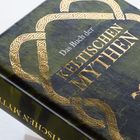 „Das Buch der keltischen Mythen“ in goldener Schrift, keltische Knoten und Küstenlandschaft im Hintergrund., Buch