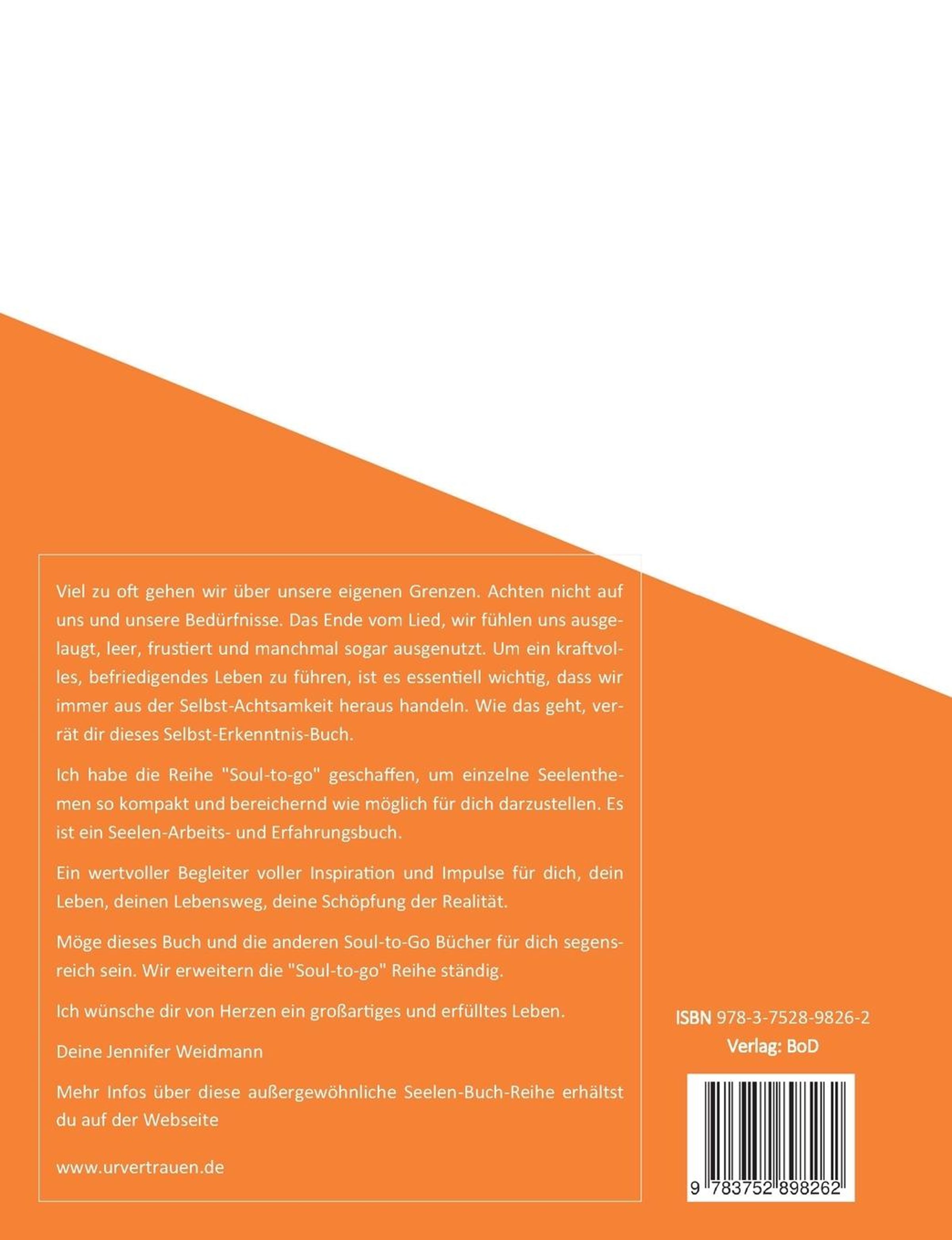 Viel zu oft gehen wir über unsere eigenen Grenzen. Achten nicht auf uns und unsere Bedürfnisse. Das Ende vom Lied, wir fühlen uns ausgelaugt, leer, frustiert und manchmal sogar ausgenutzt. Um ein kraftvolles, befriedigendes Leben zu führen, ist es essentiell wichtig, dass wir immer aus der Selbst-Achtsamkeit heraus handeln. Wie das geht, verrät dir dieses Selbst-Erkenntnis-Buch. Ich habe die Reihe "Soul-to-go" geschaffen, um einzelne Seelenthemen so kompalt und bereichernd wie möglich für dich darzustellen. Es ist ein Seelen-Arbeits- und Erfahrungsbuch. Ein wertvoller Begleiter voller Inspiration und Impulse für dich, dein Leben, deinen Lebensweg, deine Schöpfung der Realität. Mögen dieses Buch und die anderen Soul-to-Go Bücher für dich segensreich sein. Ich wünsche dir von Herzen ein großartiges und erfülltes Leben. Deine Jennifer Weidmann Wir erweitern die "Soul-to-go" Reihe ständig. Mehr Infos über diese außergewöhnliche Seelen-Buch-Reihe erhältst du auf der Webseite www. urvertrauen. de