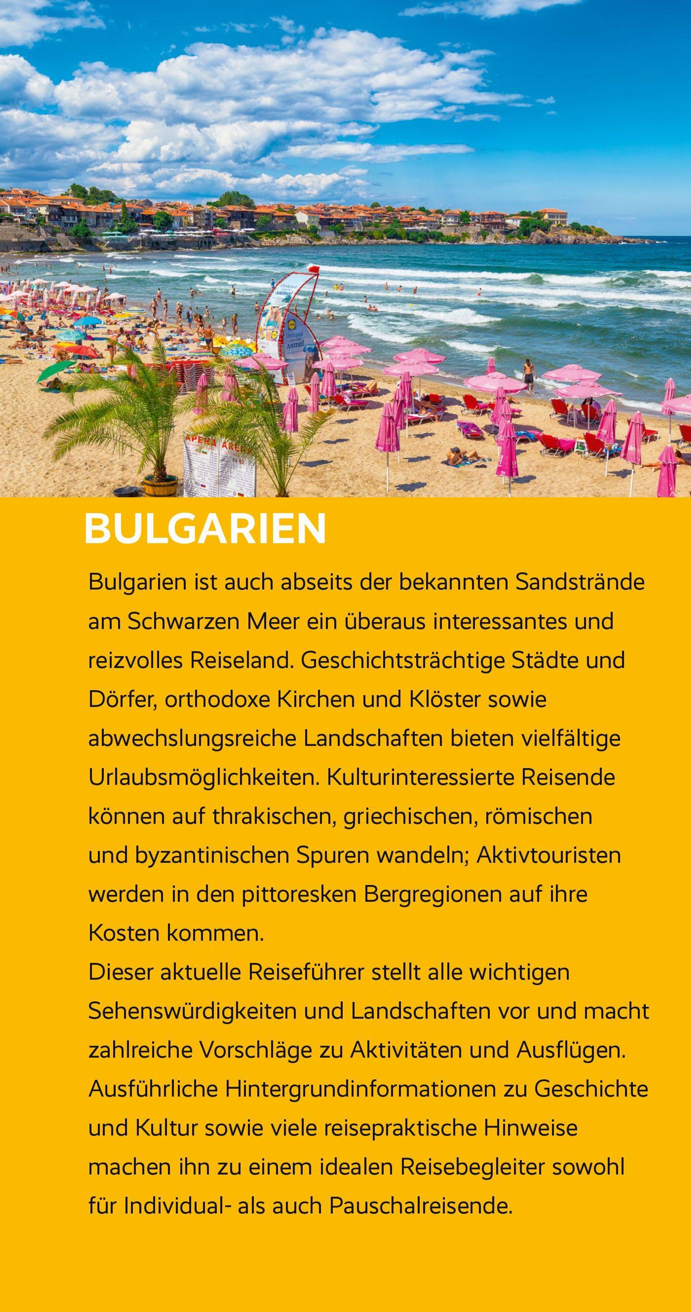 Der Trescher-Reiseführer BULGARIEN beschreibt sämtliche Regionen und Sehenswürdigkeiten zwischen Donautiefebene, Meer und Gebirge in allen Facetten. Geschichte und Kultur, Feste und Feiern, die besten Empfehlungen für Unterkunft, Essen und Trinken kommen ebenfalls ausführlich zur Sprache. Ergänzt mit zahlreichen reisepraktischen Tipps, gibt das Buch eine ebenso spannende wie kenntnisreiche und zuverlässige Lektüre unterwegs in Bulgarien an die Hand.