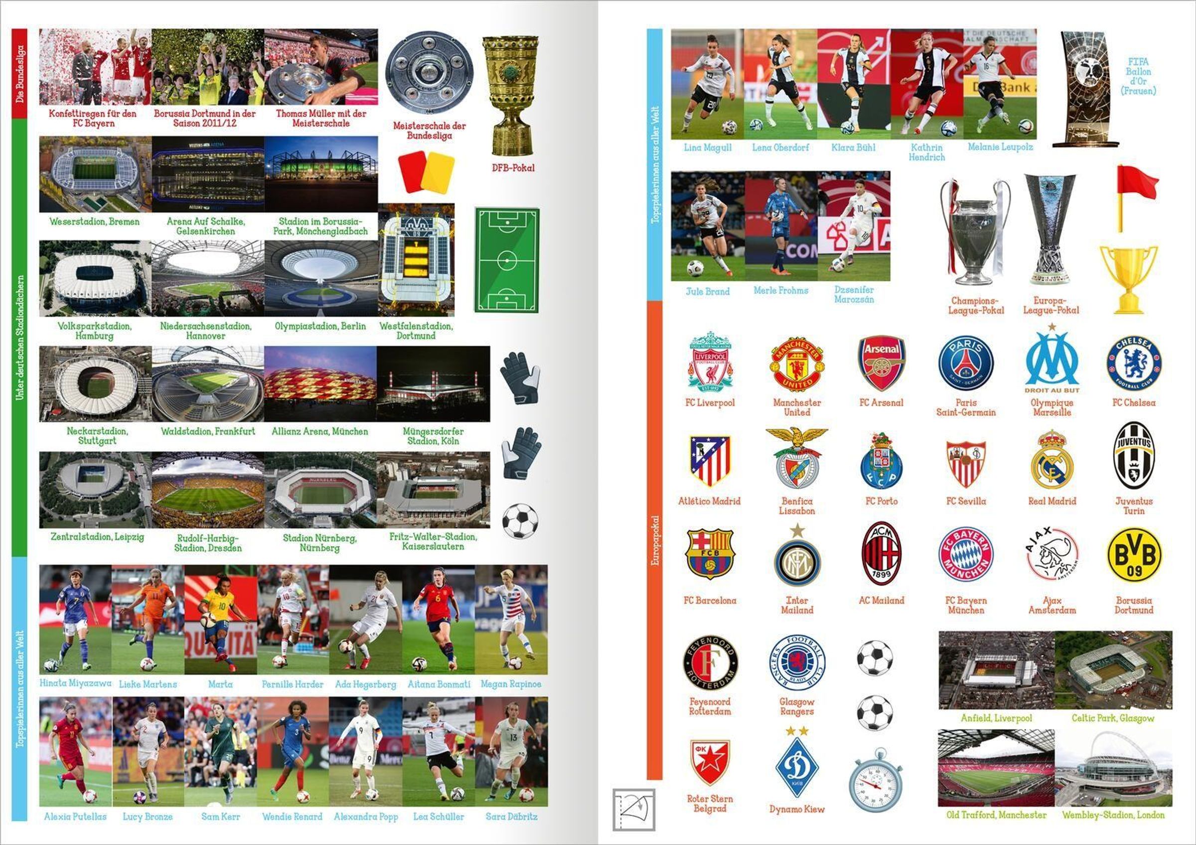 Ein Stickerheft mit vielen Fotos und Infos zu aktuellen Spielerinnen und Spielern, Trainern und Stars aus der Vergangenheit - von Mbappé, Kimmich und Gwinn bis zu Pelé!
