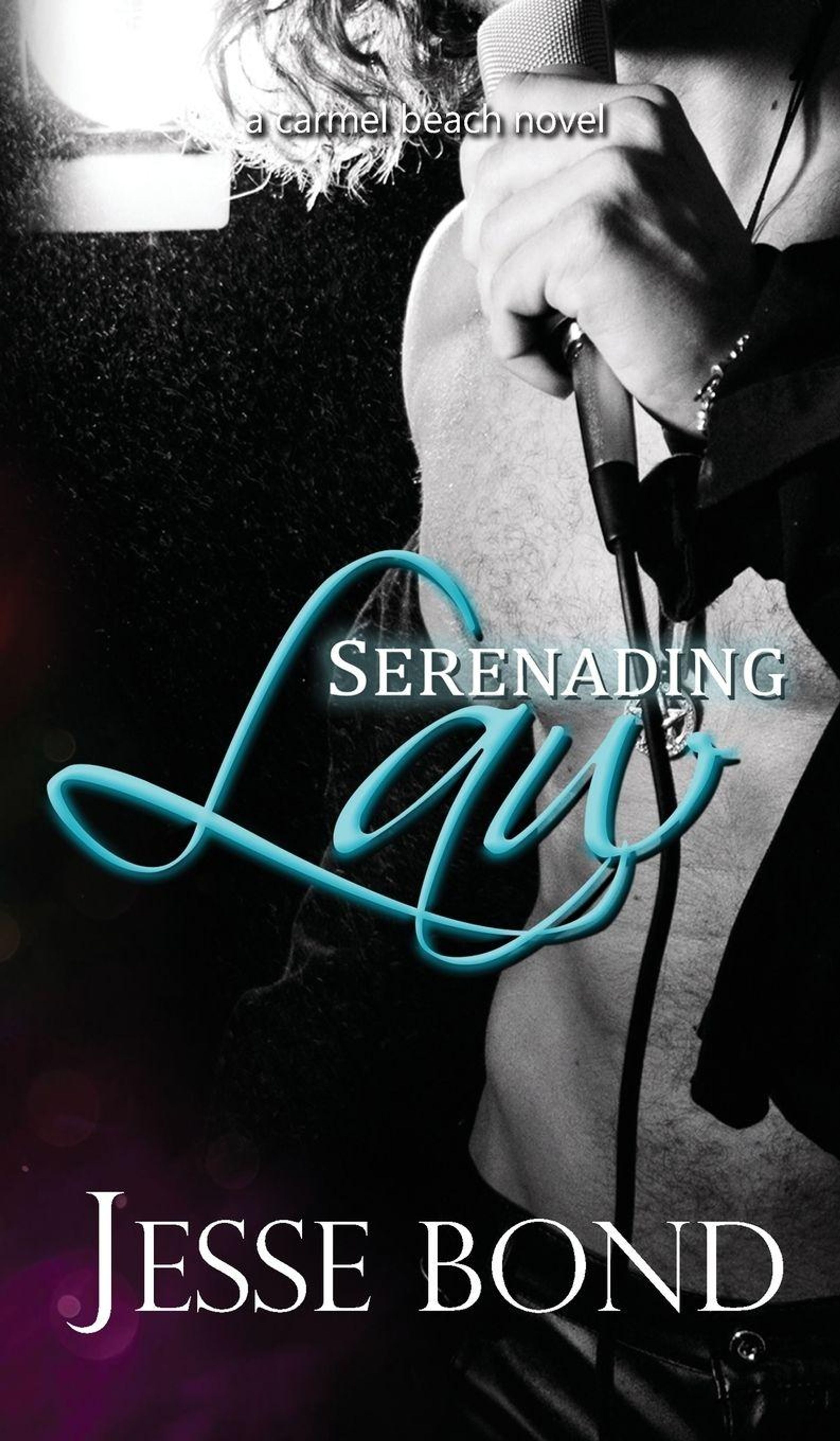 "Serenading Law", ein "carmel beach novel" von Jesse Bond. Ein Mikrofon wird von einer Person mit nacktem Oberkörper gehalten., Buch