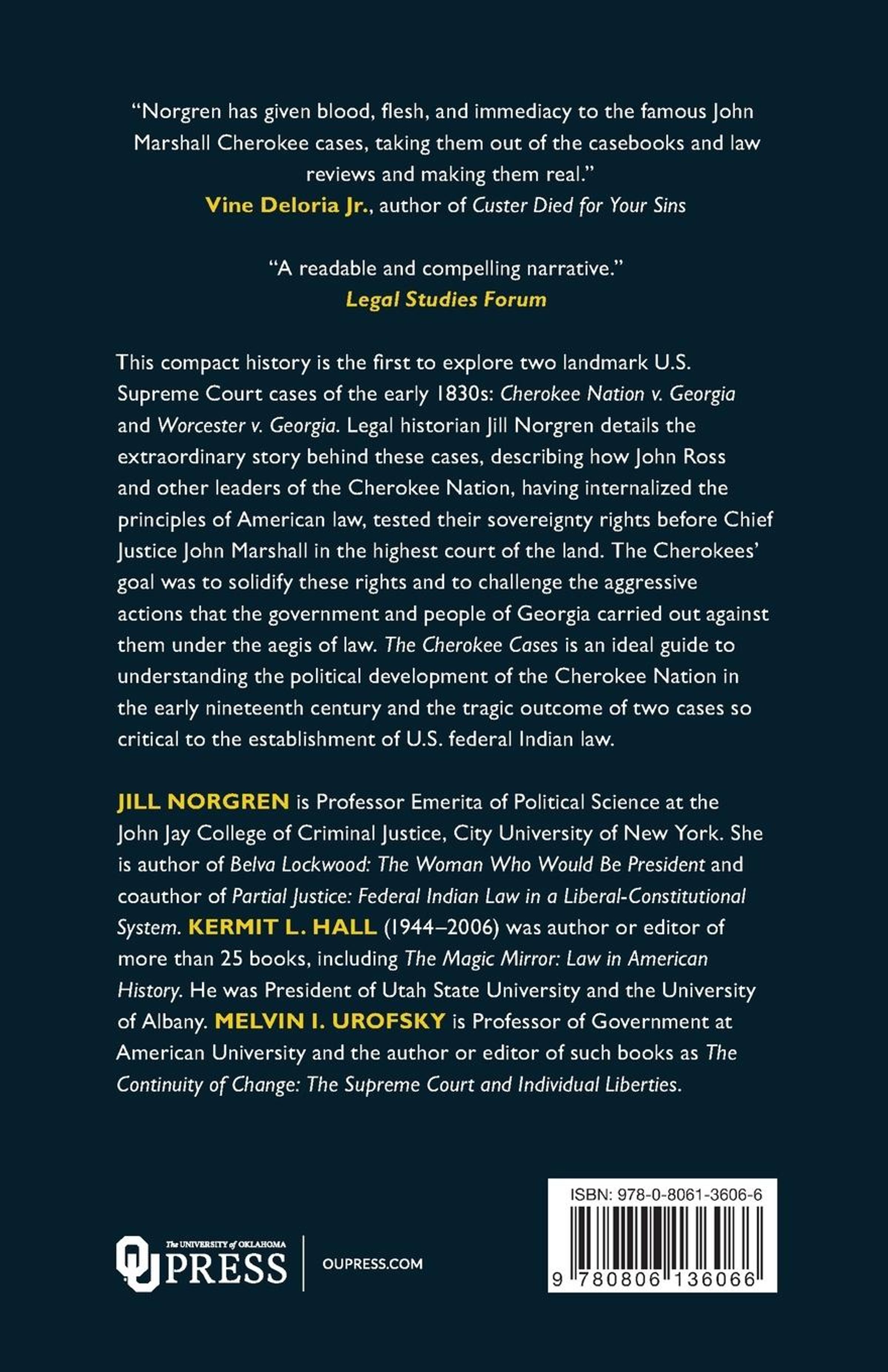 This compact history is the first to explore two landmark U. S. Supreme Court cases of the early 1830s: "Cherokee Nation v. Georgia" and "Worcester v. Georgia." Legal historian Jill Norgren details the extraordinary story behind these cases, describing how John Ross and other leaders of the Cherokee Nation, having internalized the principles of American law, tested their sovereignty rights before Chief Justice John Marshall in the highest court of the land. The Cherokees' goal was to solidify these rights and to challenge the aggressive actions that the government and people of Georgia carried out against them under the aegis of law. Written in a style accessible both to students and to general readers, "The Cherokee Cases" is an ideal guide to understanding the political development of the Cherokee Nation in the early nineteenth century and the tragic outcome of these cases so critical to the establishment of U. S. federal Indian law.