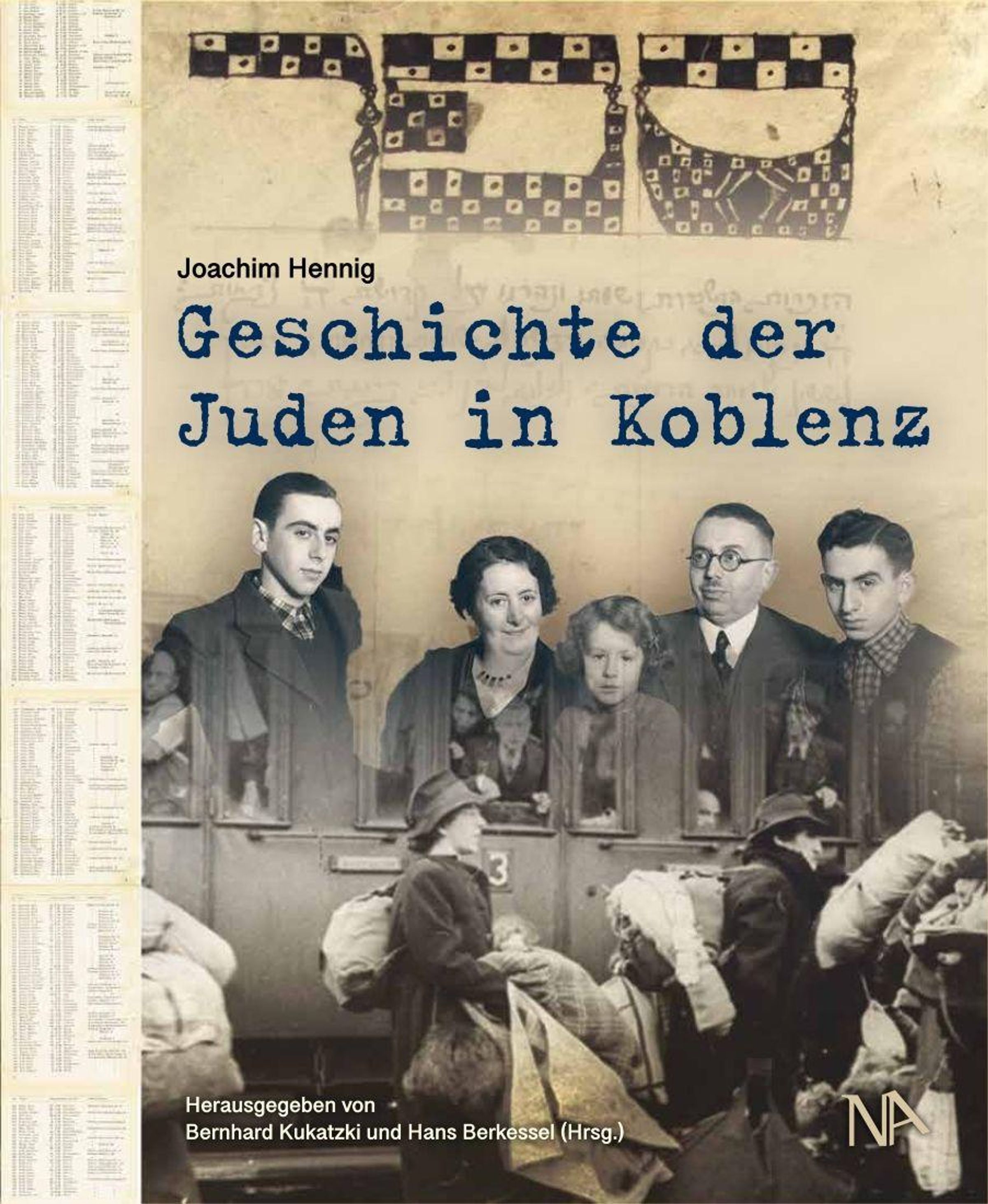 "Geschichte der Juden in Koblenz" von Joachim Hennig. Fünf Personen vor einem historischen Fotozug im Hintergrund., Buch