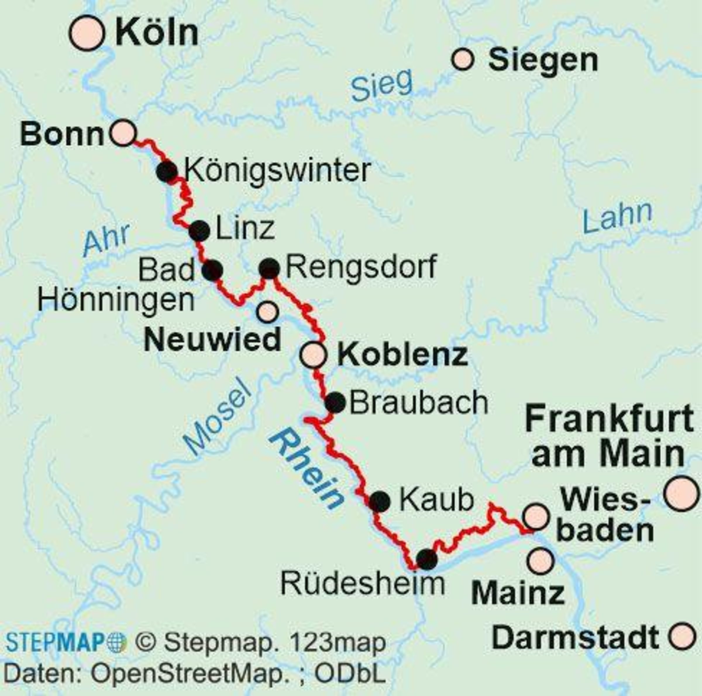 Von Bonn bis Wiesbaden verläuft der Rheinsteig auf der rechten Rheinseite und durchquert dabei auf seinen 320 km neben Siebengebirge und Rheingau das gesamte UNESCO-Welterbe Oberes Mittelrheintal. Auf 20 Etappen erschließen sich die beeindruckenden Felsformationen des Rheintals, pittoreske Städtchen, steile Weinberge, mittelalterliche Klöster und einst mächtige Burgen und Schlösser.