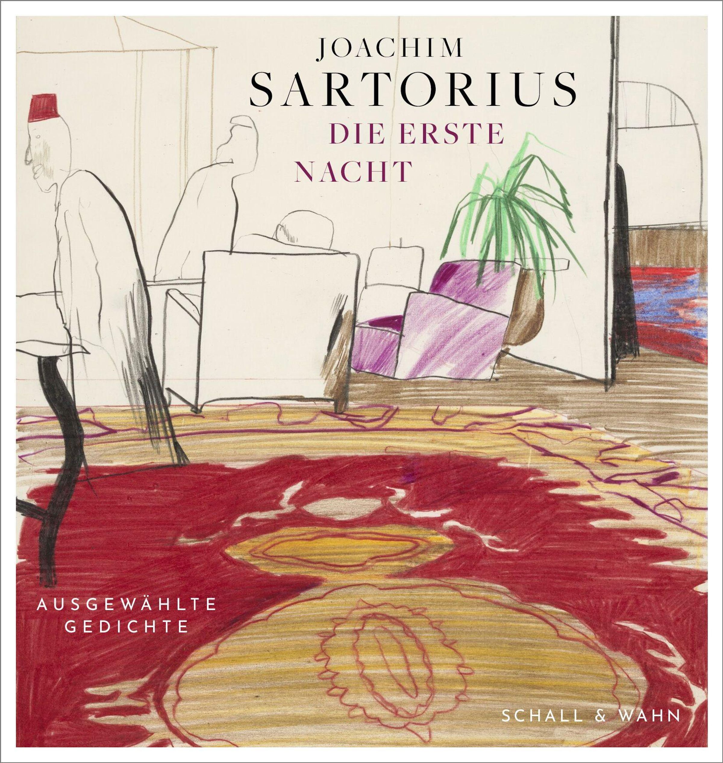 "JOACHIM SARTORIUS DIE ERSTE NACHT. AUSGEWÄHLTE GEDICHTE SCHALL & WAHN" Ein skizziertes Wohnzimmer mit buntem Teppich., CD