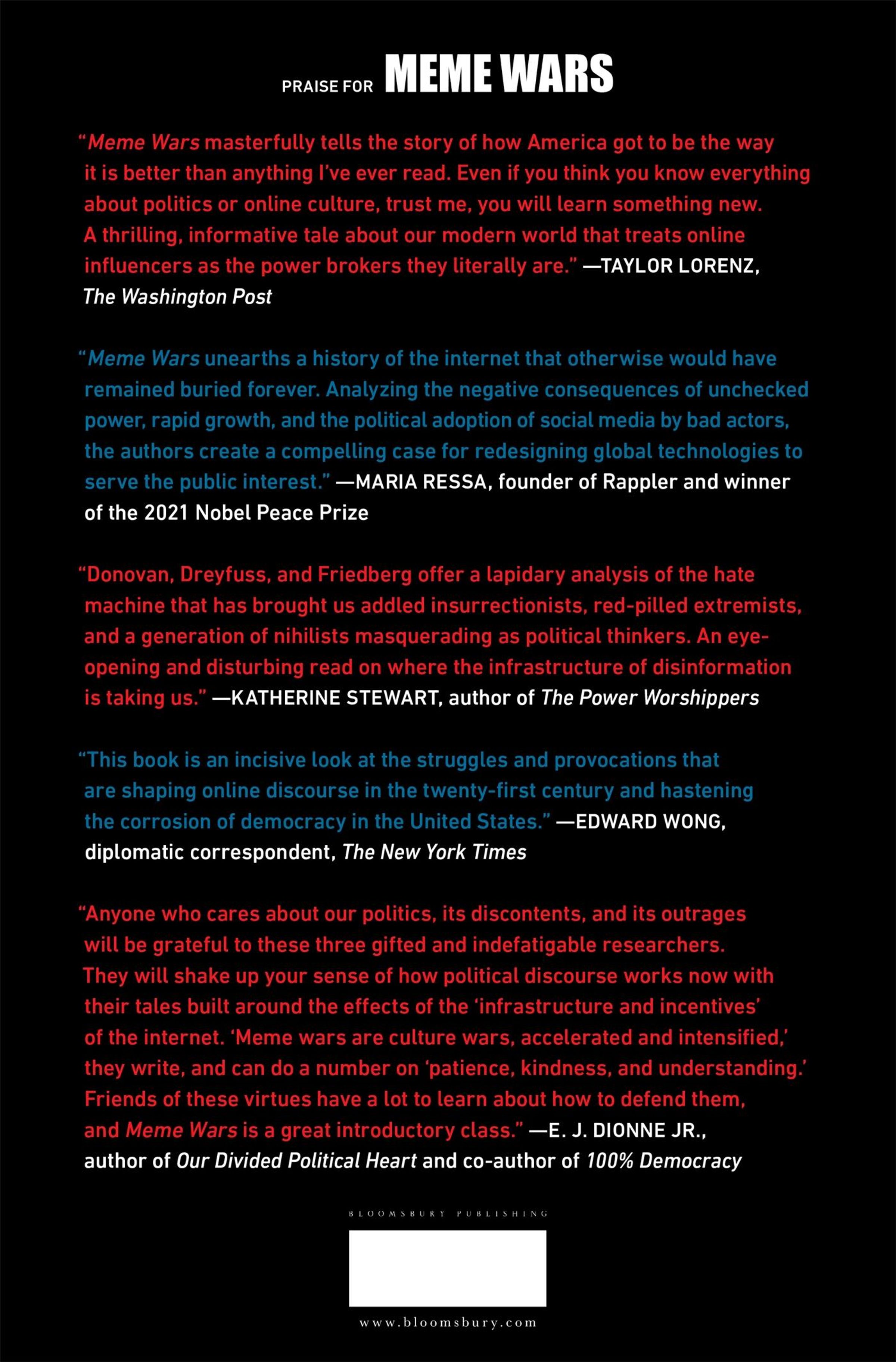 Memes have long been dismissed as inside jokes with no political importance. Nothing could be further from the truth. Memes are bedrock to the strategy of conspiracists such as Alex Jones, provocateurs like Milo Yiannopoulos, white nationalists like Nick Fuentes, and tacticians like Roger Stone. While the media and most politicians struggle to harness the organizing power of the internet, the "redpill right" weaponizes memes, pushing conspiracy theories and disinformation into the mainstream to drag people down the rabbit hole. These meme wars stir strong emotions, deepen partisanship, and get people off their keyboards and into the streets--and the steps of the US Capitol.