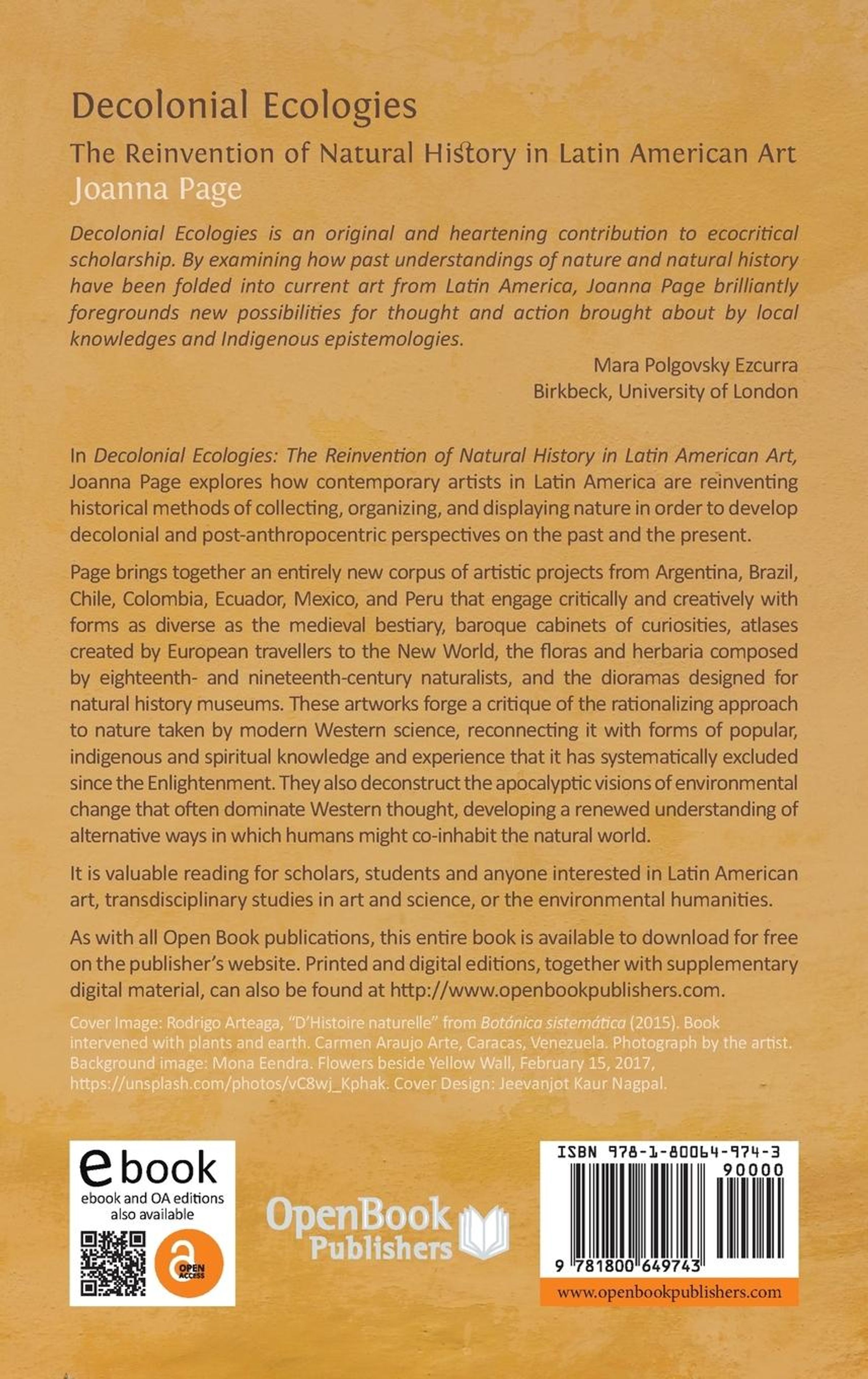 Page brings together an entirely new corpus of artistic projects from Argentina, Brazil, Chile, Colombia, Ecuador, Mexico, and Peru that engage critically and creatively with forms as diverse as the medieval bestiary, baroque cabinets of curiosities, atlases created by European travellers to the New World, the floras and herbaria composed by eighteenth- and nineteenth-century naturalists, and the dioramas designed for natural history museums. She explores how artists develop decolonial and post-anthropocentric perspectives on the collections and expeditions that were central to the evolution of European natural history. Their works forge a critique of the rationalizing approach to nature taken by modern Western science, reconnecting it with forms of popular, indigenous and spiritual knowledge and experience that it has systematically excluded since the Enlightenment.