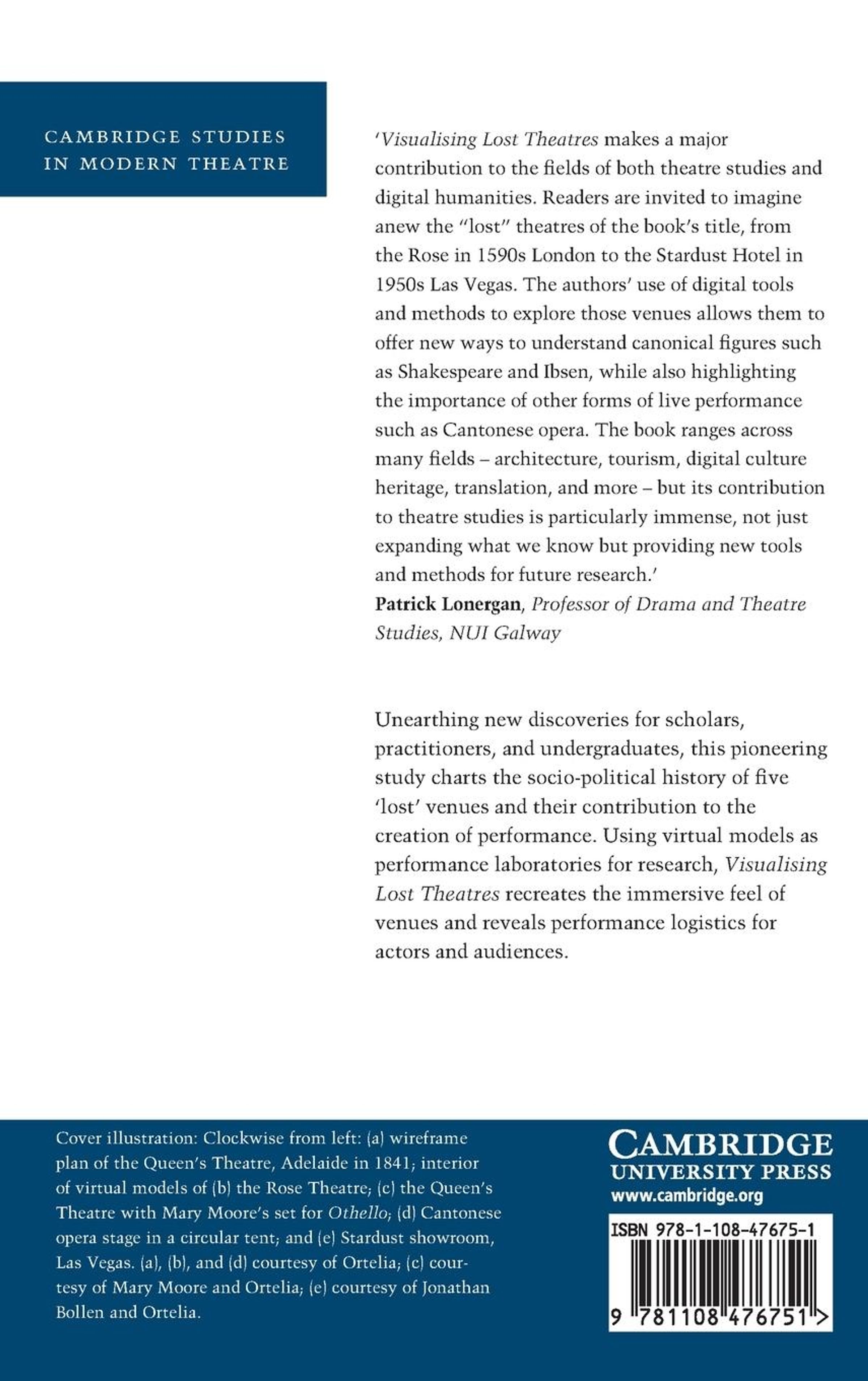 "Visualising Lost Theatres argues that once a theatre is demolished, its theatrical, social, and cultural worlds are also at risk. Yet venues are living systems, not than passive containers of performance. A visualisation-or virtual reconstruction-can provide the visual and immersive feel of a venue, revealing performance logistics for actors and audience. We examine virtual models of the Rose Theatre in 1590s London where Christopher Marlowe's plays were performed; Komediehuset in Bergen, Norway, where Henrik Ibsen learned how to be a playwright in the 1850s; the Queen's Theatre, built in 1841, which represents an empire-building movement in Adelaide, South Australia; Cantonese opera touring in circus tents in Australia's goldfields from the 1850s; and the Stardust showroom in 1950s Las Vegas which shaped commercial theatre for a tourist audience. Each reveals new knowledge about the venues themselves, theatrical form, and performer-audience relationships. The book overall offers a methodology for this new technology in theatre studies: it illustrates how the virtual models can, in conjunction with performers and designers, be performance laboratories to test out the written archive"--