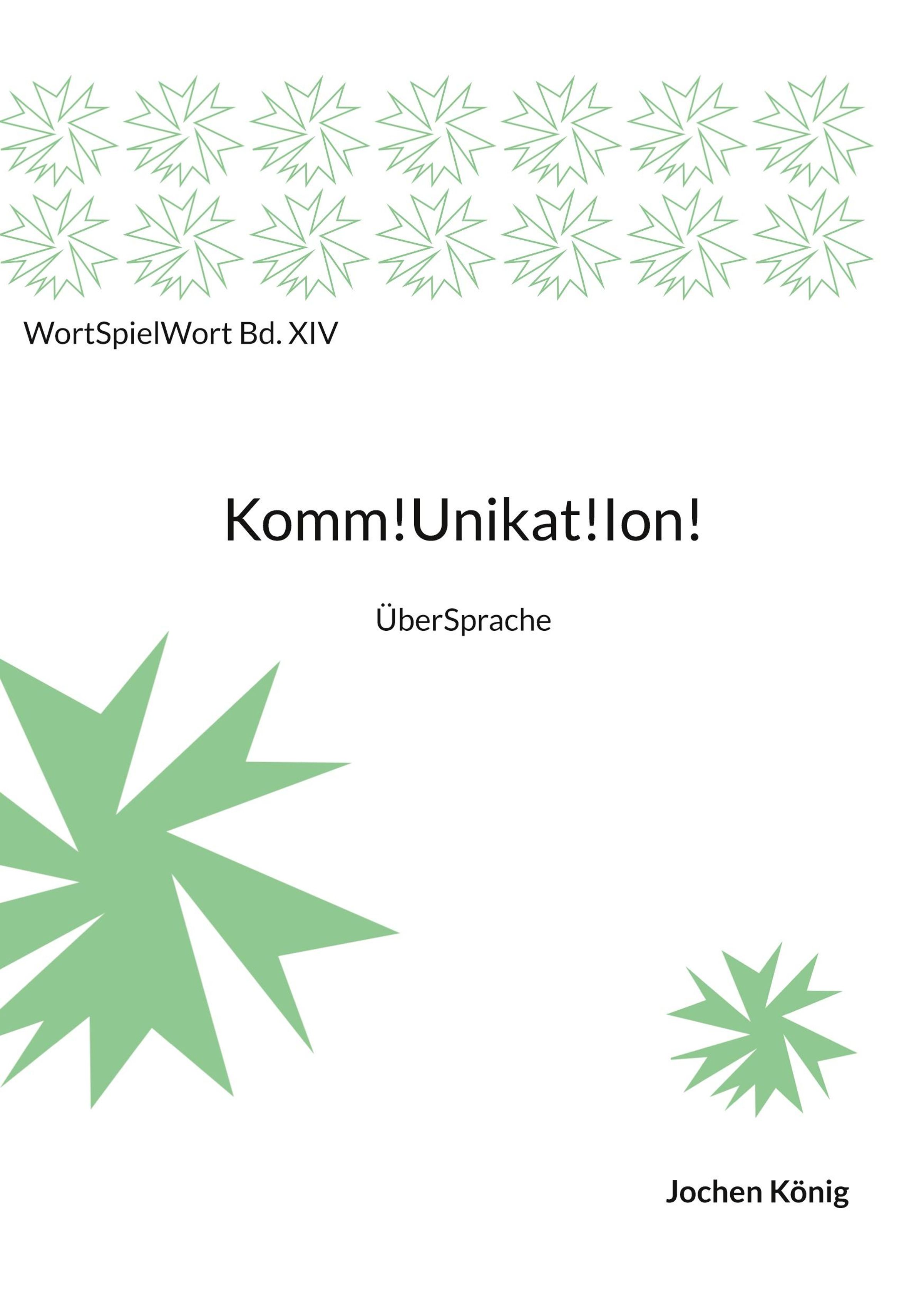 Text: "WortSpielWort Bd. XIV", "Komm!Unikat!Ion!", "ÜberSprache", "Jochen König". Grüne, sternförmige Grafiken., Buch