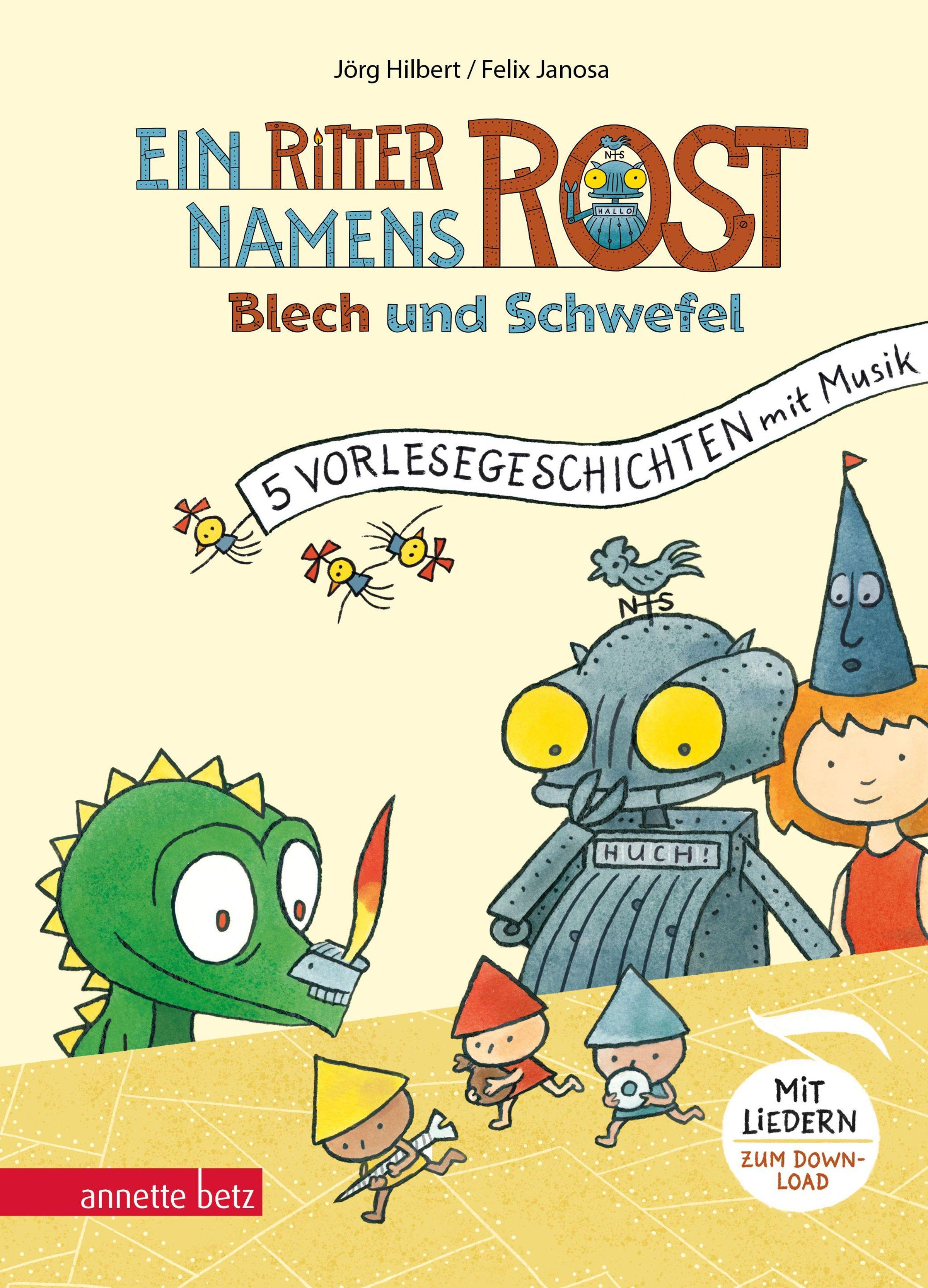 "Ein Ritter namens Rost", "Blech und Schwefel", "5 Vorlesegeschichten mit Musik". Bunte Figuren und ein Roboter., Buch