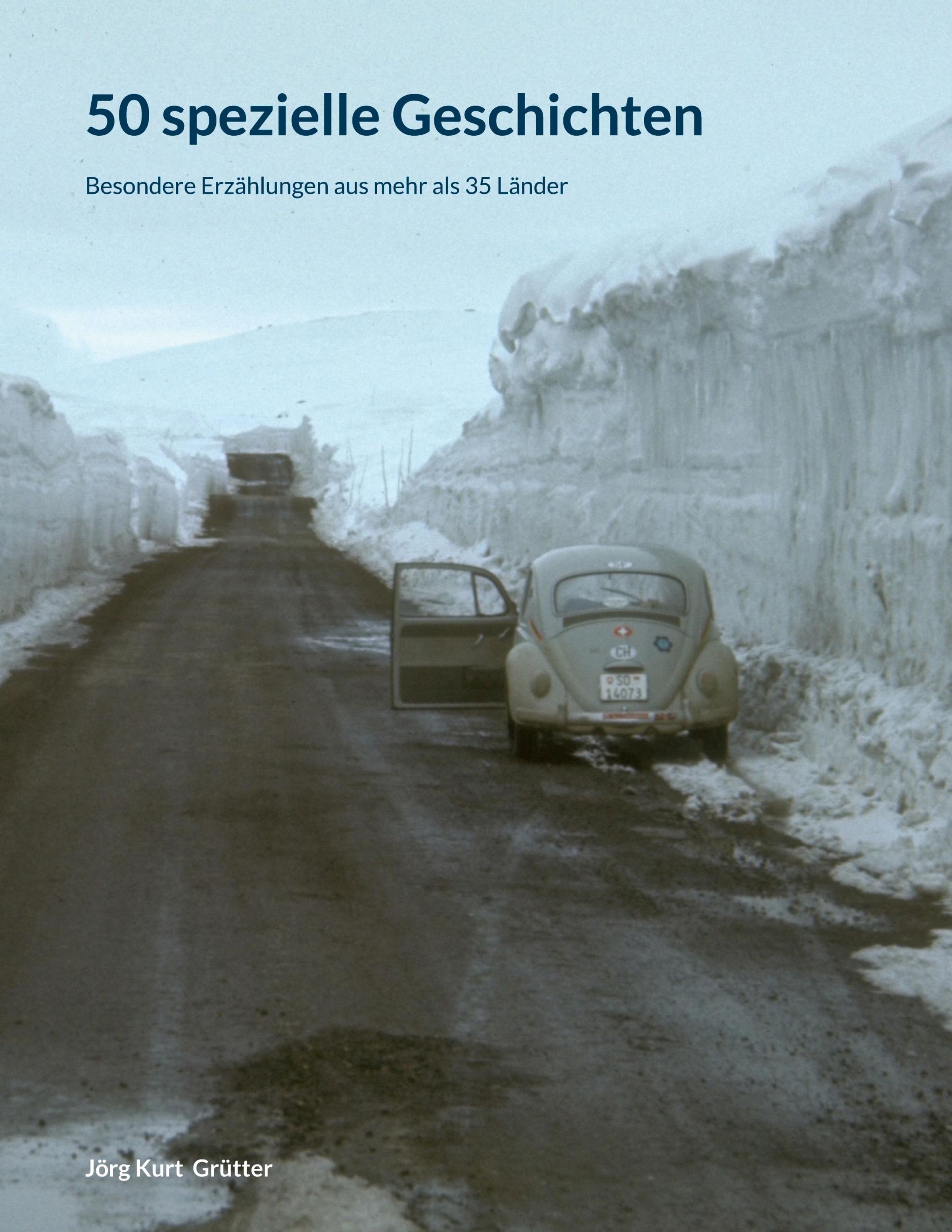 "50 spezielle Geschichten. Besondere Erzählungen aus mehr als 35 Länder." Ein VW Käfer auf schneebedeckter Straße., Buch
