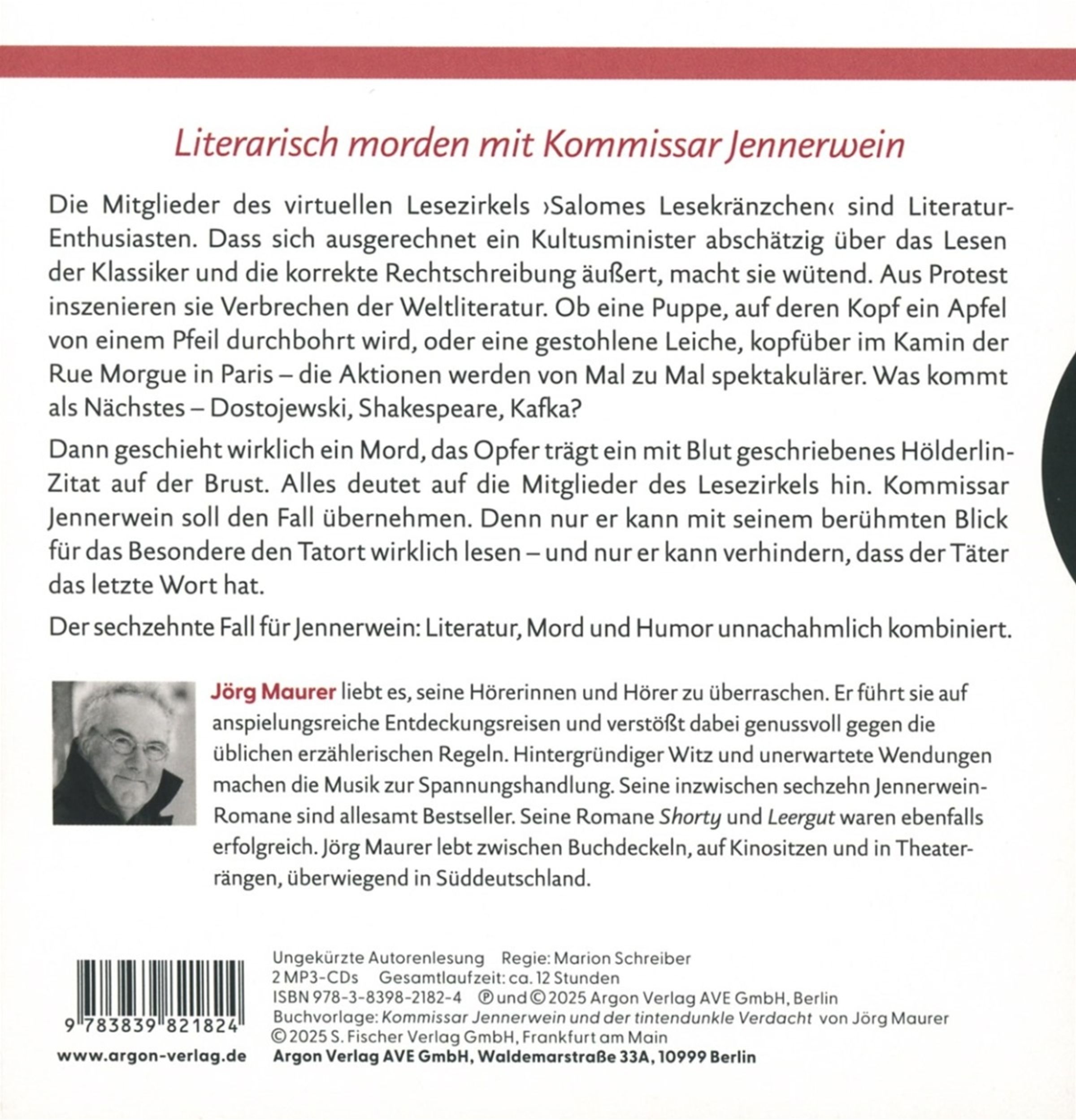 Dann geschieht wirklich ein Mord, das Opfer trägt ein mit Blut geschriebenes Hölderlin-Zitat auf der Brust. Alles deutet auf die Mitglieder des Lesezirkels hin. Kommissar Jennerwein soll den Fall übernehmen. Denn nur er kann mit seinem berühmten Blick für das Besondere den Tatort wirklich lesen - und nur er kann verhindern, dass der Täter das letzte Wort hat.