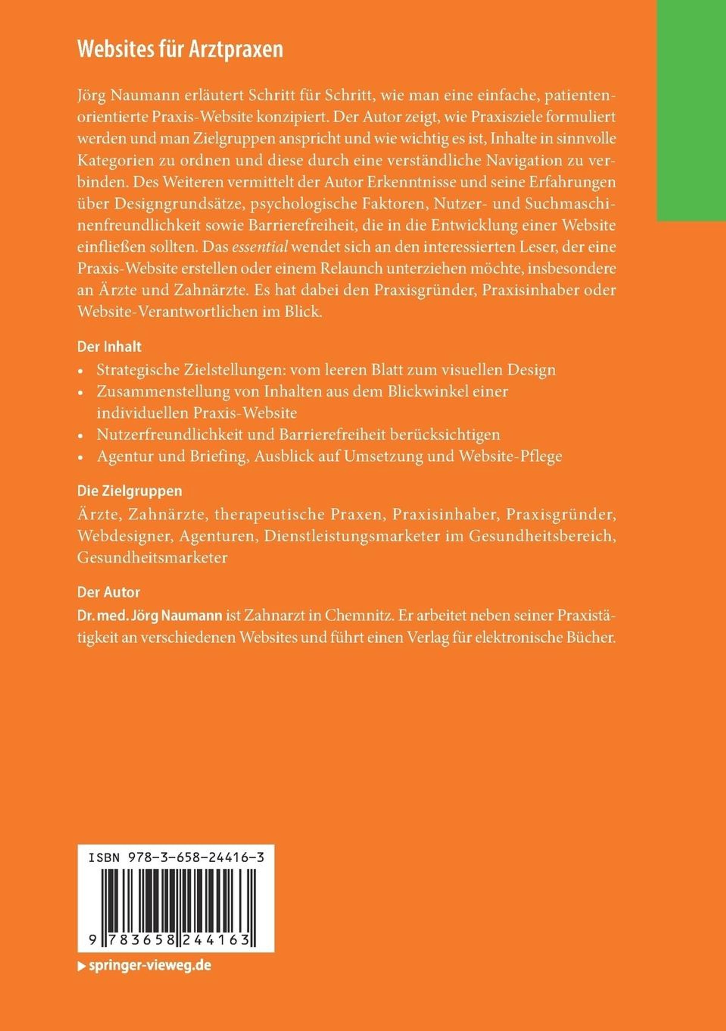Jörg Naumann erläutert Schritt für Schritt, wie man eine einfache, patientenorientierte Praxis-Website konzipiert. Der Autor zeigt, wie Praxisziele formuliert werden und man Zielgruppen anspricht und wie wichtig es ist, Inhalte in sinnvolle Kategorien zu ordnen und diese durch eine verständliche Navigation zu verbinden. Des Weiteren vermittelt der Autor Erkenntnisse und seine Erfahrungen über Designgrundsätze, psychologische Faktoren, Nutzer- und Suchmaschinenfreundlichkeit sowie Barrierefreiheit, die in die Entwicklung einer Website einfließen sollten. Das essential wendet sich an den interessierten Leser, der eine Praxis-Website erstellen oder einem Relaunch unterziehen möchte, insbesondere an Ärzte und Zahnärzte. Es hat dabei den Praxisgründer, Praxisinhaber oder Website-Verantwortlichen im Blick. Der Autor Dr. med. Jörg Naumann ist Zahnarzt in Chemnitz. Er arbeitet neben seiner Praxistätigkeit an verschiedenen Websites und führt einenVerlag für elektronische Bücher.