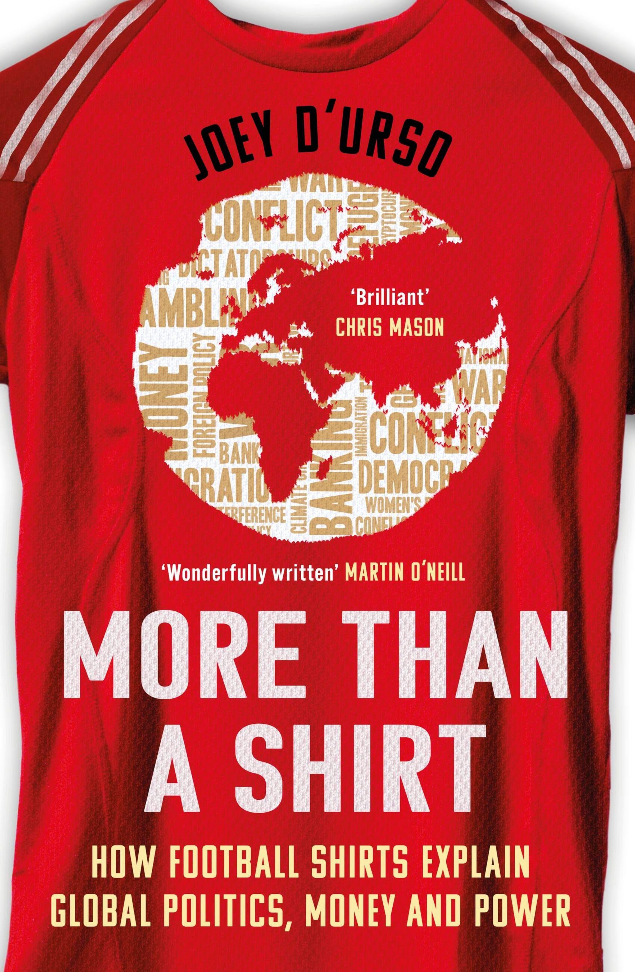 Titel: "More Than a Shirt". Autor: Joey D'Urso. Thema: Fußballtrikots und globale Politik. Rotes Trikot im Hintergrund., Buch